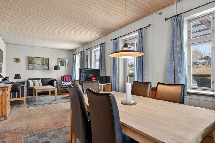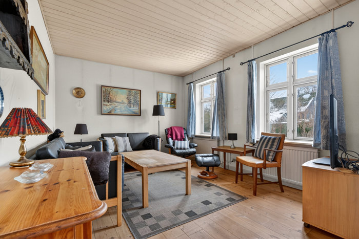 Entréen fungerer som den pæne indgang mod vejen, mens bryggerset har udgang til en lille overdækning, som igen har forbindelse til udhuset. Derudover rummer stueplan et praktisk køkken og et hvidt klinkebadeværelse med bruseniche. Et enkelt værelse får I også, mens stuen råder over masser af kvadratmeter til jeres daglige samlingspunkter. I øvrigt er der terrassedør til baghaven, mens de mange vinduer giver et lysindfald, som er svært at sige nej til. Til sammenligning byder førstesalen på blotlagte bjælker og et enkelt værelse – naturligvis med mulighed for flere.