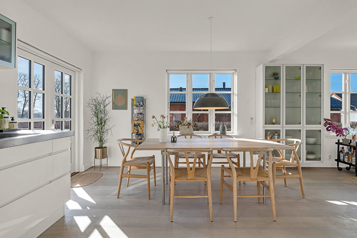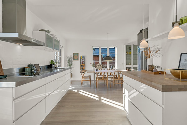 Fra entré træder man ind i et flot lyst tidsløst køkken/alrum med hvide grebsfri elementer, stålbordplade samt udgang til morgenterrasse mod øst. Herudover nedgang til kælderen.