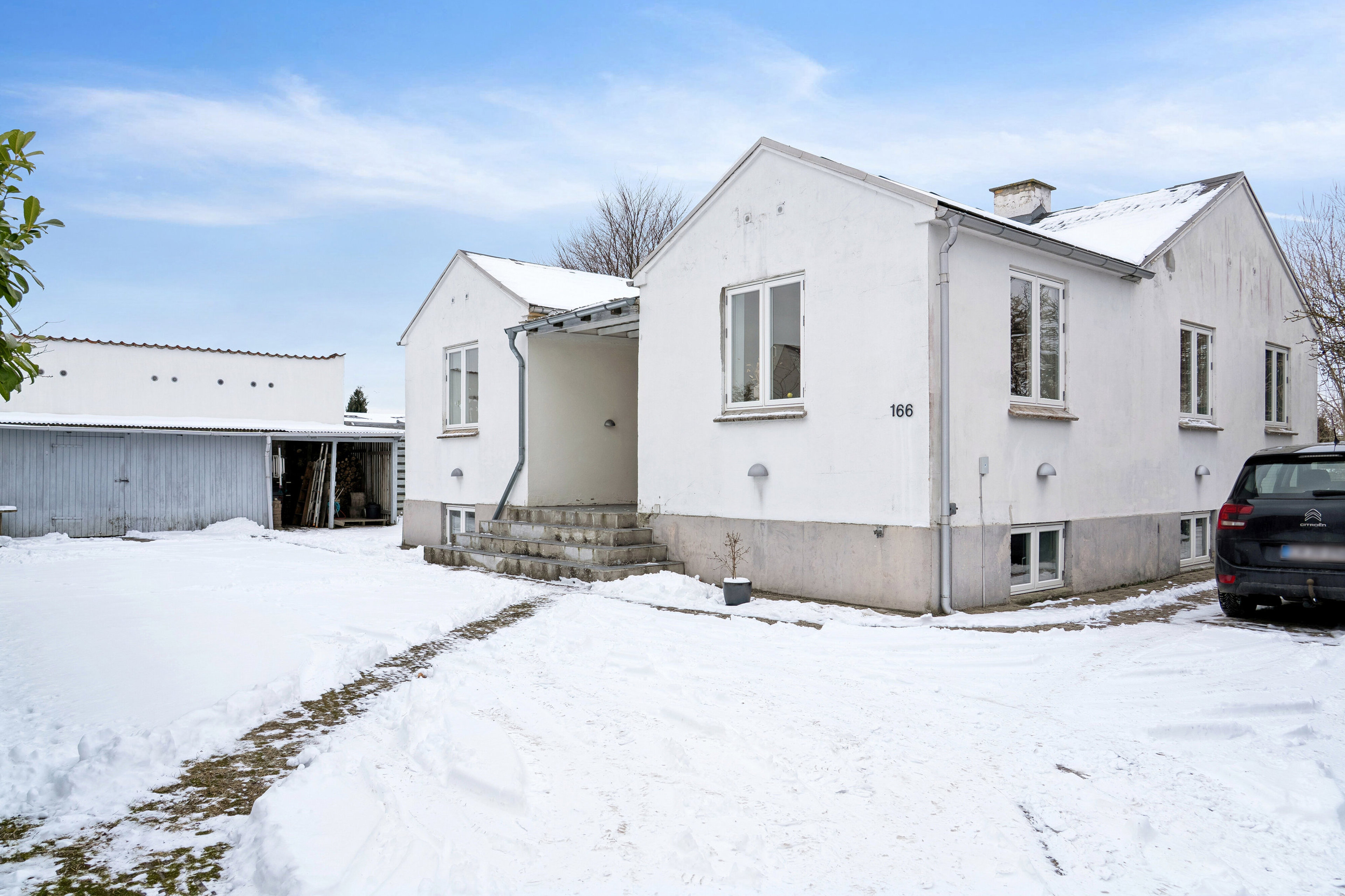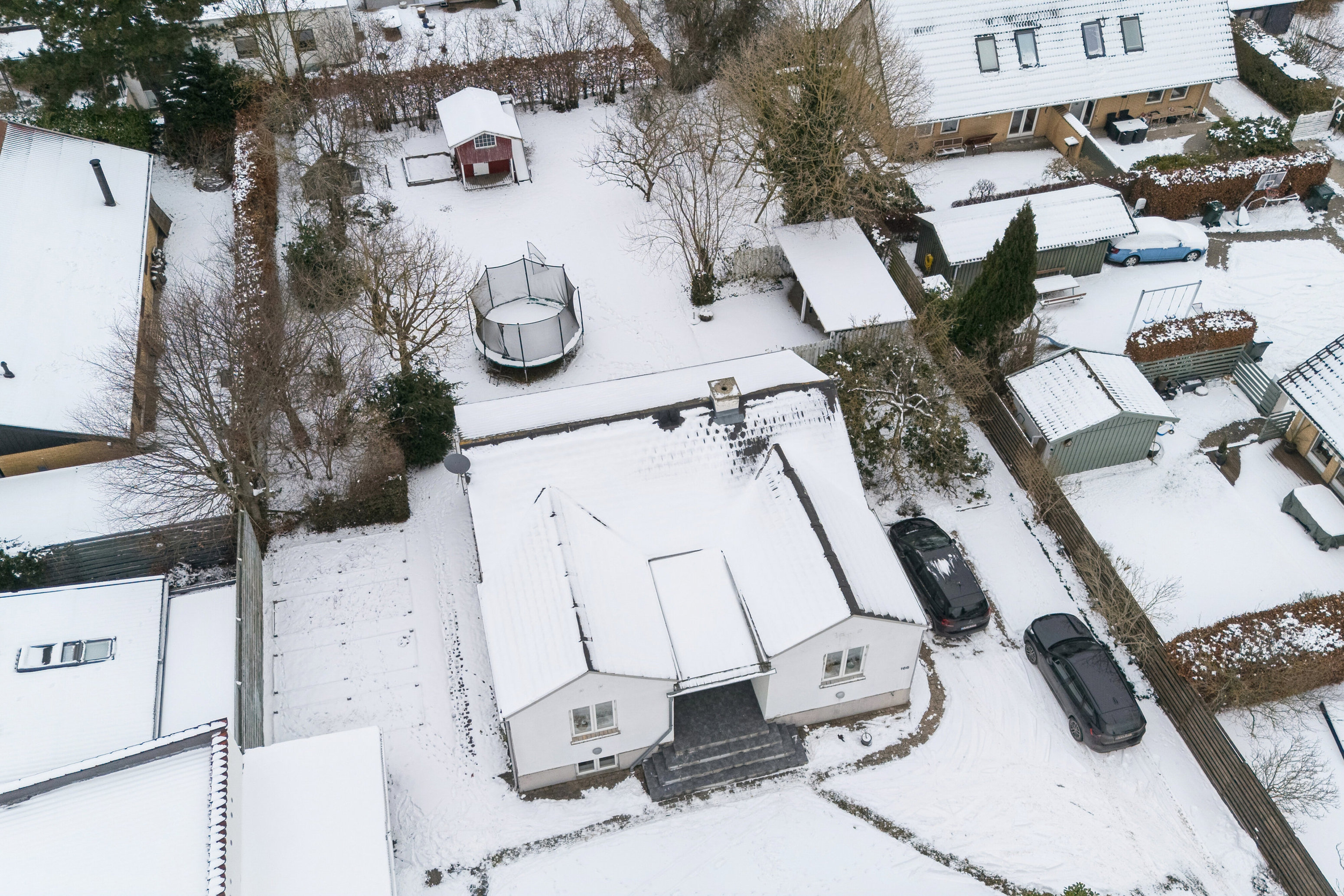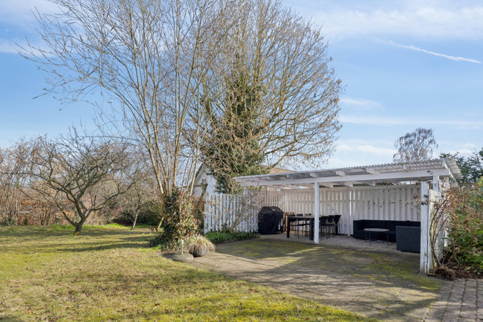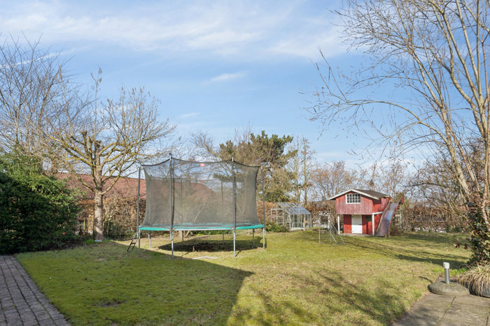 Udenfor finder I flere solrige opholdssteder på terrasserne, der omkranser huset. Mens forhaven modtager sol fra syd, er der plads til leg og boldspil i baghaven, hvor der er græs, opvoksede træer og gode legefaciliteter. Ejendommen afrundes af en bred fliseindkørsel samt et skur til haveredskaber og cykler.
