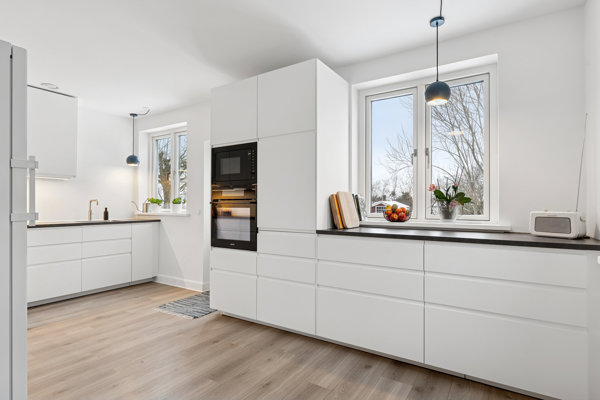 Balancen mellem det nære og det praktiske er kendetegnende for denne bolig med de store rum til samvær og privatliv. I det vinklede opholdsrum smelter køkkenet sammen med stuen og danner ramme om alt fra fælles madlavning i det stilrene køkken til langsomme søndage på sofaen.