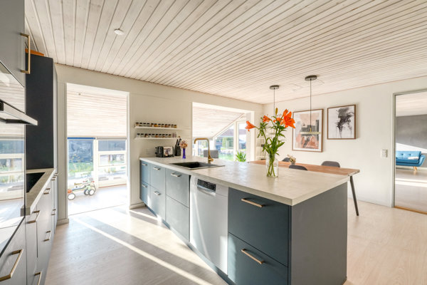 Intet kan dog slå de skønne opholdsrum, hvor I både får en lys stue og et lækkert køkken-alrum. Selve køkkenet er moderniseret med mørkeblå elementer, lys bordplade og gyldne greb, og en integreret bonusstue giver lys, luft og plads til det hyggelige opholdsrum. Her er desuden tilføjet en varmepumpe, så temperaturen altid kan justeres.
