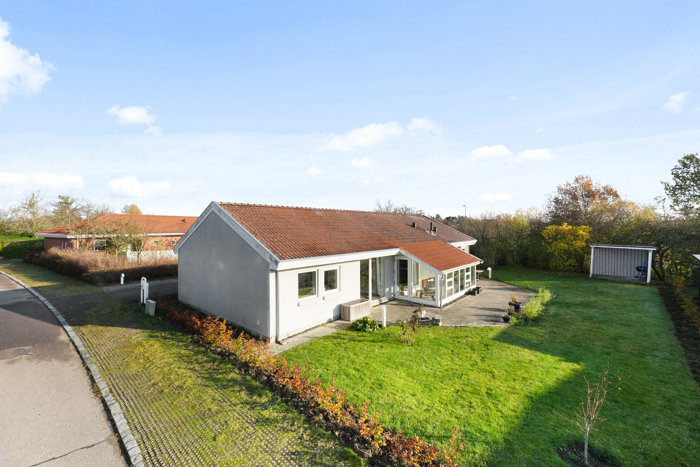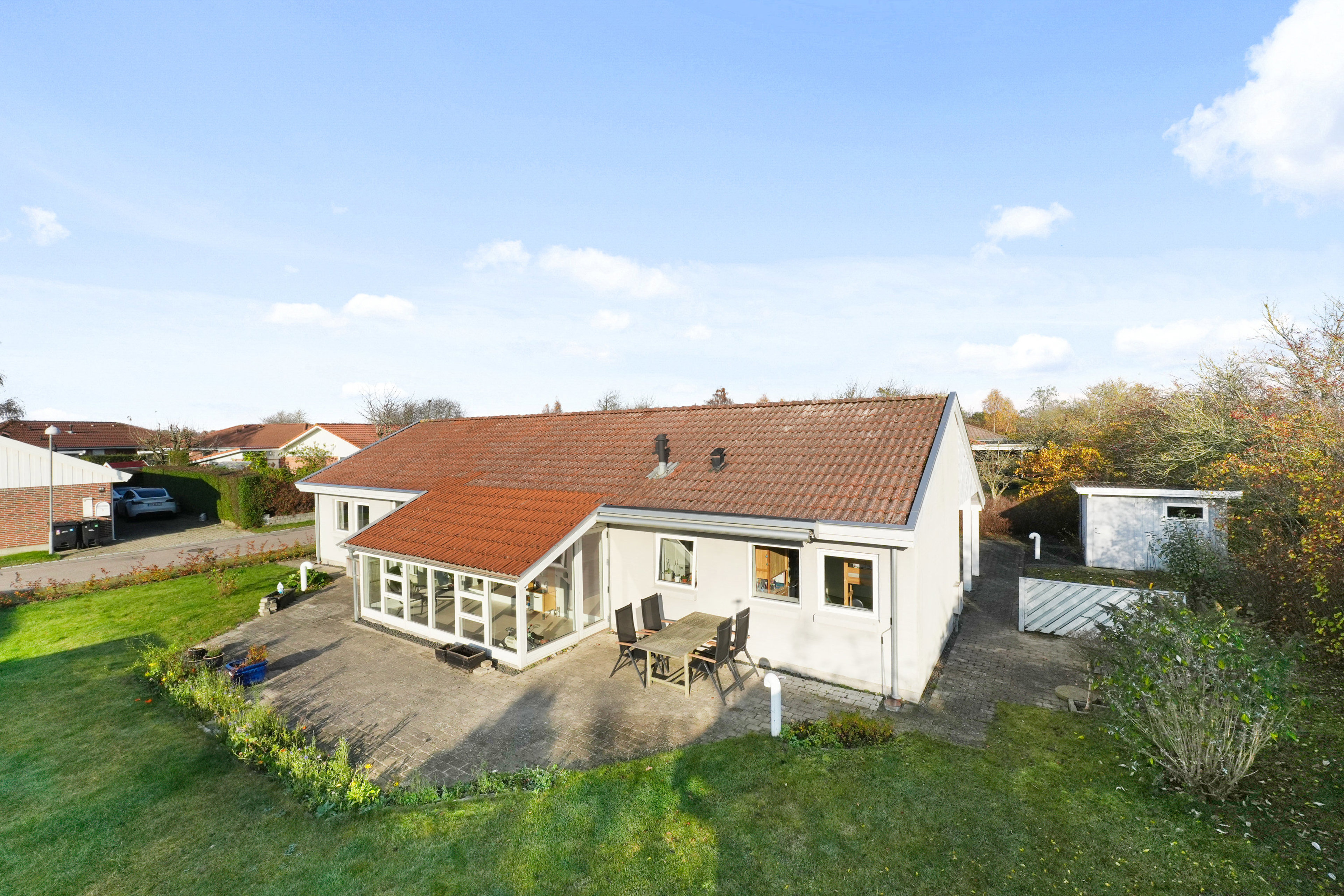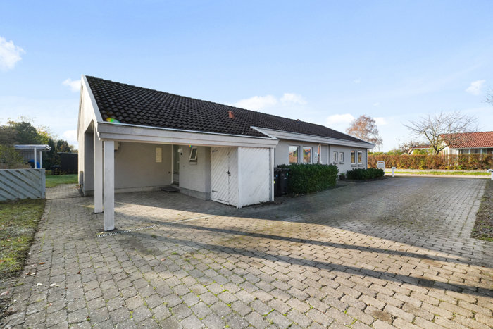 Tørskoet forbindelse til carporten er én af de detaljer, som man hurtigt forstår at sætte pris på, og da der er rigelig plads til parkering i indkørslen, kan carporten ubesværet dublere som en ugeneret, overdækket terrasse. Havens primære terrasse har sol det meste af dagen, og dertil har det ene redskabsskur en fin overdækning, så familiens grillmester altid kan stå i tørvejr.