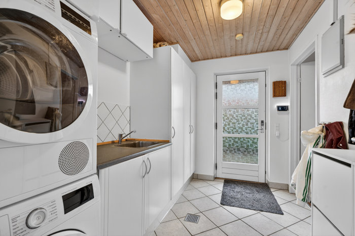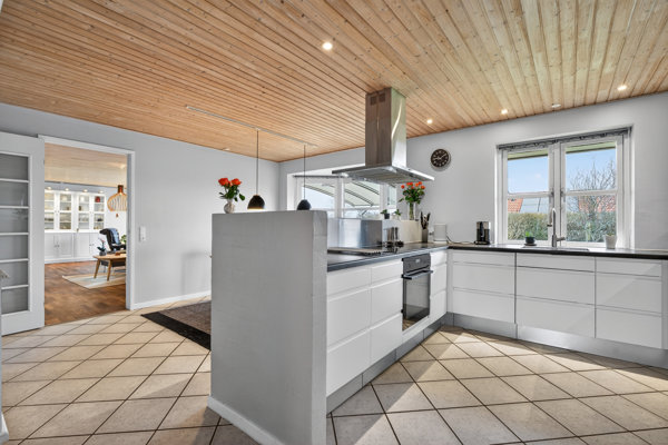 Også køkkenet er moderniseret, og de hvide, grebsfri elementer er et sikkert valg. Køkkenet indgår i et decideret køkken-alrum, mens den egentlige opholdsstue folder sig ud ved siden af. Begge opholdsrum har et stort karnapvindue mod den vestvendte have, så lysindfaldet er mere end almindeligt godt, og afrundingsvis får I en lys entré, som f.eks. kan fungere som kontor eller trænings rum, og et pænt bryggers.