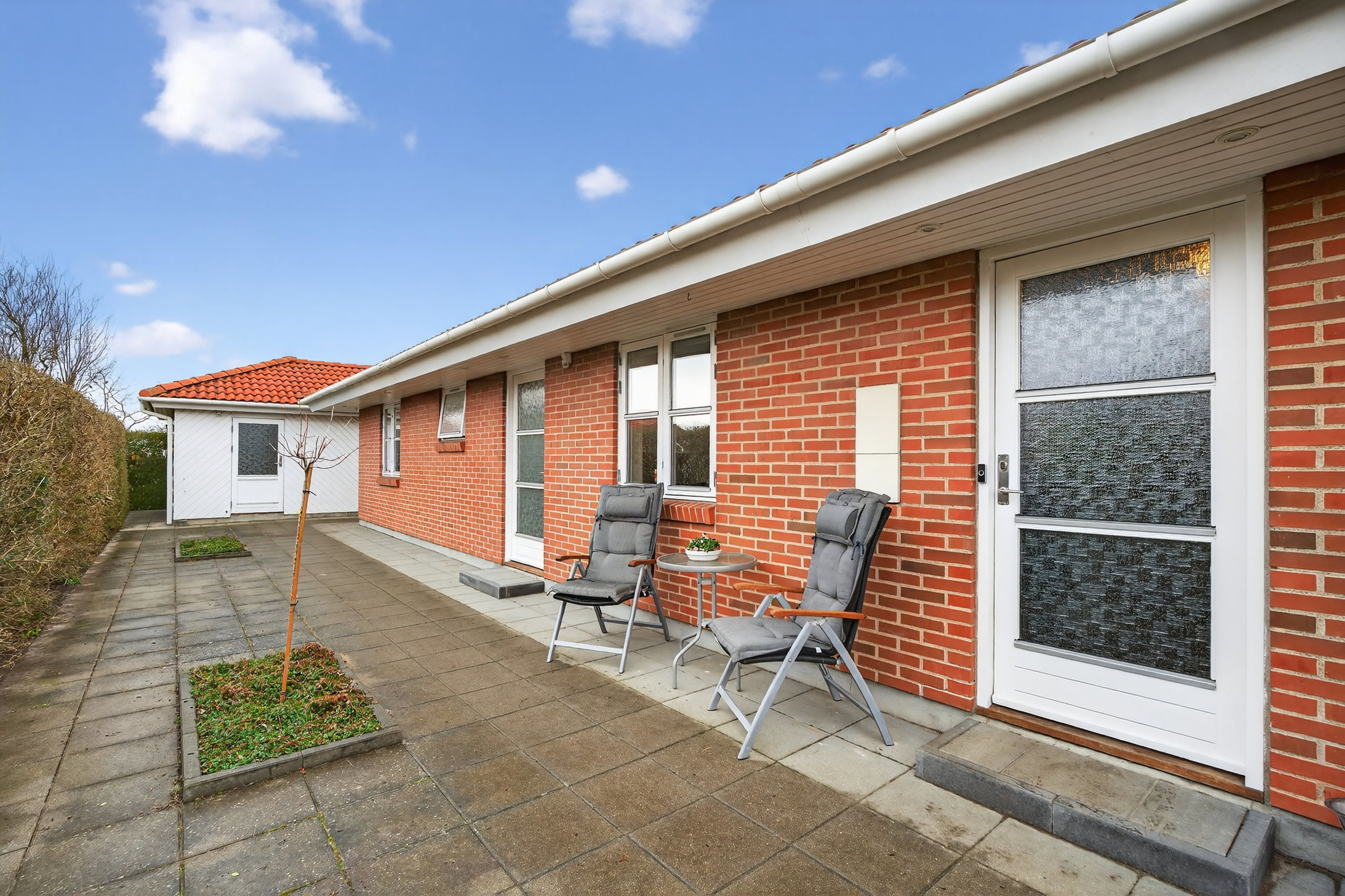 Selvom vejrguderne stiller sig i vejen, er der gode betingelser for at nyde mange gode stunder i det fri. Den store, vestvendte terrasse er delvist overdækket, og den er afskærmet mod vinden af et diskret glasværn. Også i den overdækkede terrasse er der lys og terrassevarmer som er med til at forlænge sommeren og aftnerne. I sig selv er haven ugeneret og ikke mindst nem.