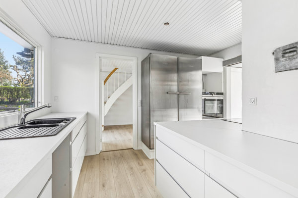 Boligens hjerte er opholdsområdet i stueplan, hvor store sydvendte vinduespartier skaber en fantastisk forbindelse mellem inde og ude. Her strømmer dagslyset ind, mens udsigten over marker og himmel bliver en naturlig del af indretningen. Rummet rummer både køkken, spiseplads og opholdsafdeling og har direkte udgang til terrassen, hvilket giver optimale rammer for både hverdag og gæstebesøg.