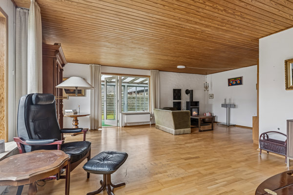Fra spisestuen er der adgang til den store stue, som byder på fine indretningsmuligheder. Planløsningen giver mulighed for at tænke i nye løsninger og eventuelt ændre rummenes disponering, så boligen tilpasses moderne behov og ønsker.