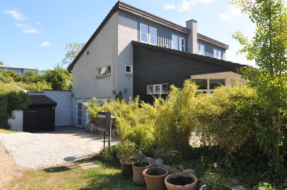 Ejendommen er opført i 2003 og fremstår hvidfilset med sort betontegltag. Når døren bliver åbnet, bliver du budt velkommen til et boligareal på 187 kvm samt en kælder på i alt 97 kvm, der er indrettet med en stor garage med elport og en stor gildestue, motionsrum eller teenage-/gæsteafdeling.