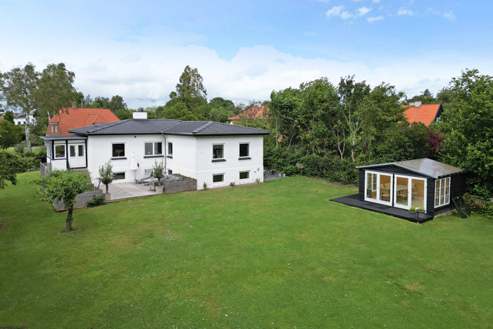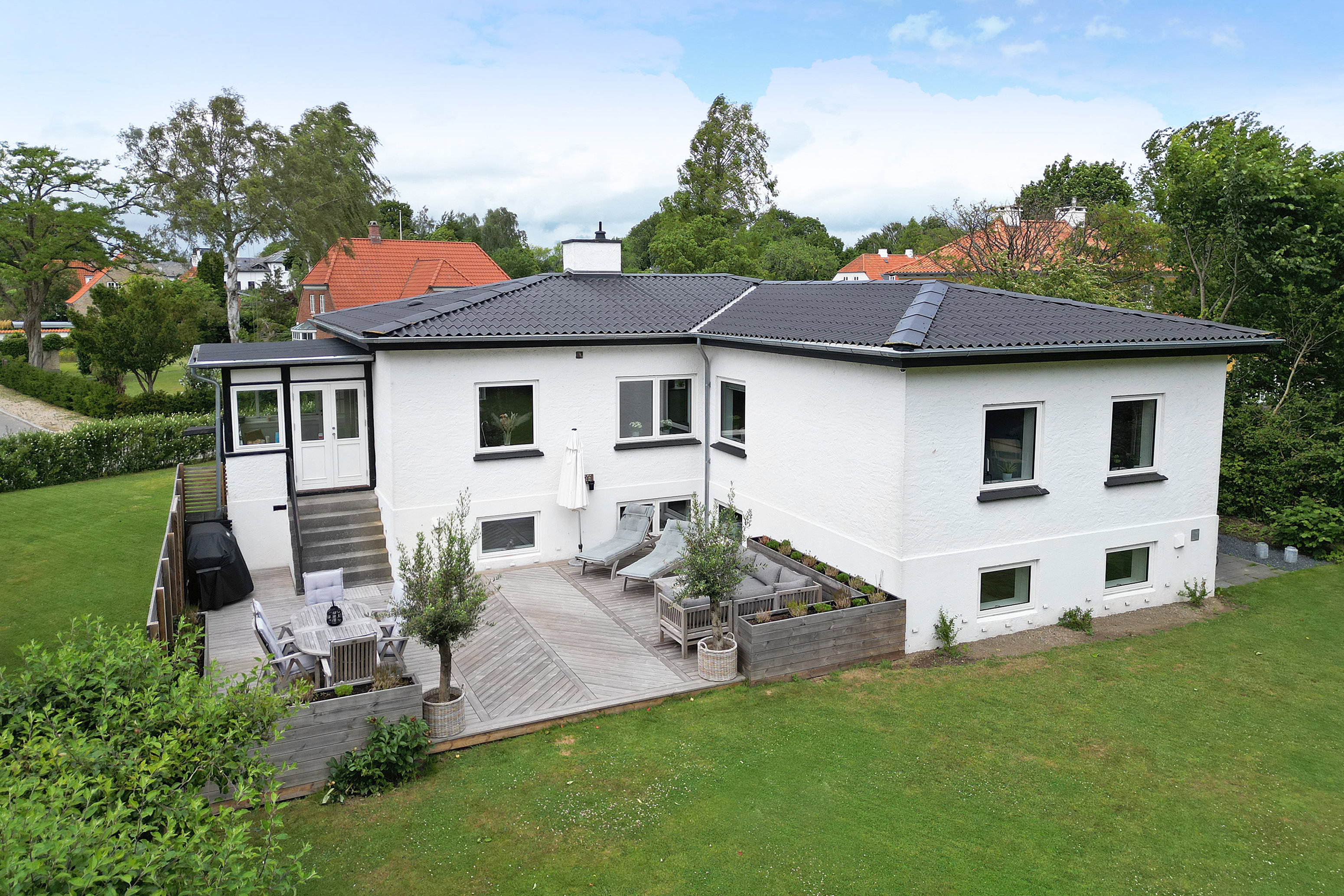 Haven er helt ugeneret og har karakter af en gammel, idyllisk “farmor-have” med frugttræer og en rolig stemning. Den store træterrasse og det flotte orangeri med glastag forlænger sæsonen og skaber rammerne for skønne udendørs oplevelser året rundt.