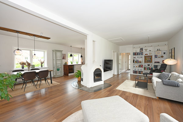 Hjemmet byder på hele 280 veldisponerede etagemeter med god loftshøjde – også i den lyse og yderst anvendelige underetage. I stueplan finder du et soveværelse, et stort værelse (pt. walk-in), samt en elegant vinkelstue med muret pejs og brændeovnsindsats, som kan nydes fra både stue og køkken. Spisestuen ligger i åben forbindelse med det store Designa-køkken, hvor ensartede gulve og pudsede vægge binder rummene flot sammen. Der er fra alrummet adgang til hyggelig lyst veranda med udgang til haven.