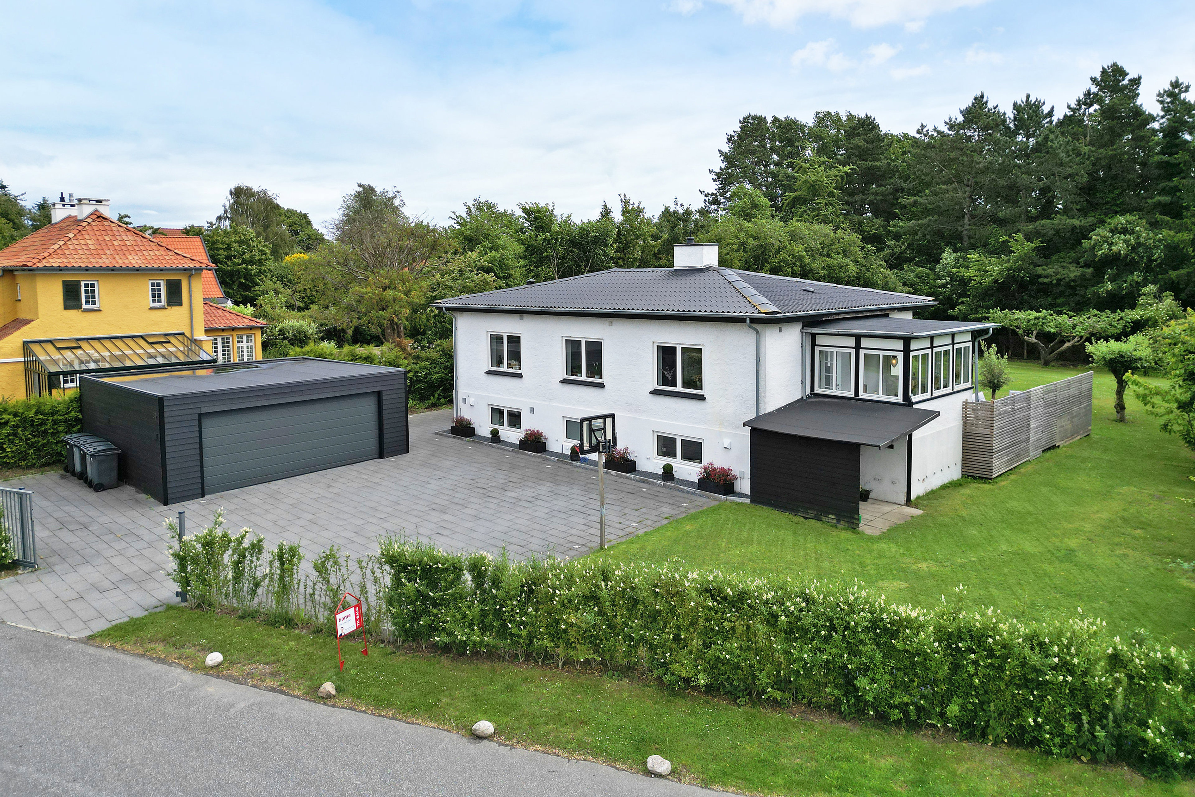 Allerede ved ankomsten imponerer den store, flisebelagte indkørsel med gitterport og en lukket dobbeltgarage på 42 m2 opført i 2020, der er isoleret og forberedt til to elbiler.