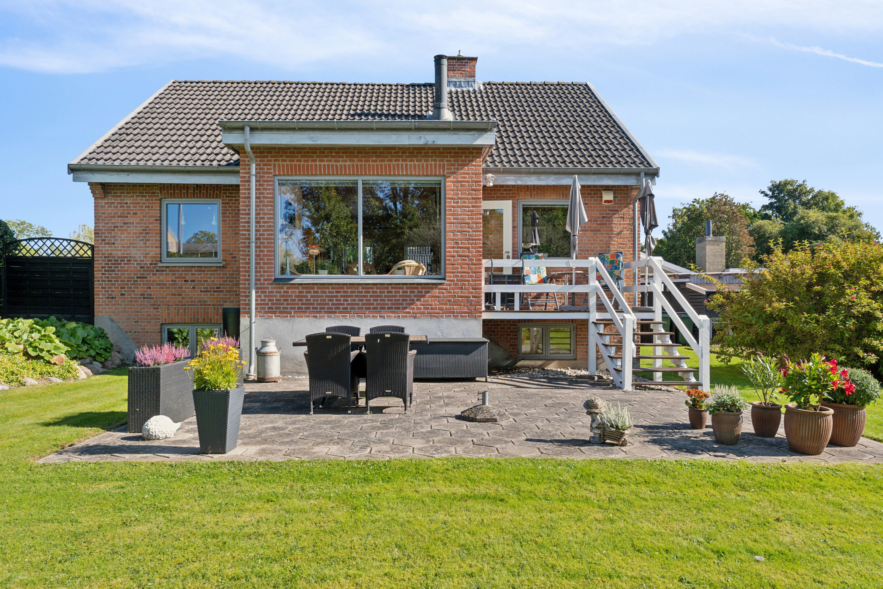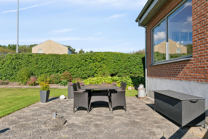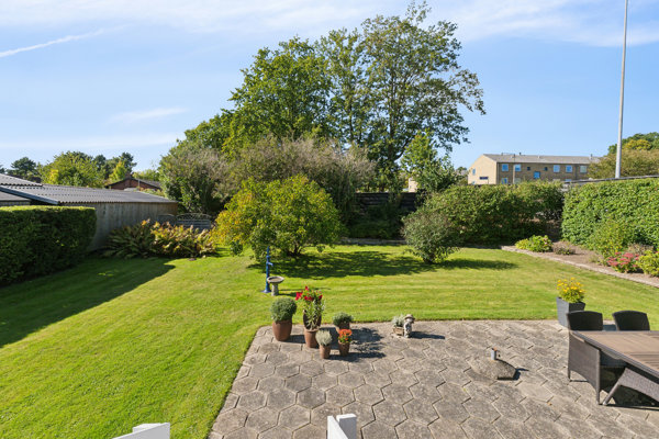 Haven: Hæk og hegn afskærmer haven, der er anlagt med græsplæne, bede og forskellige buske. Eftermiddags- og aftensolen kan nydes på den lille hævede træterrasse eller på fliseterrassen, hvor der er plads til spisebord, grill og parasol. Der medfølger et par skure og forrest på grunden er der parkeringsareal.