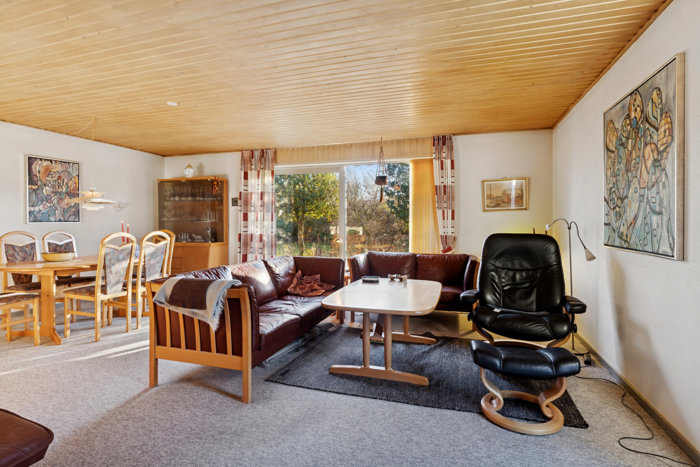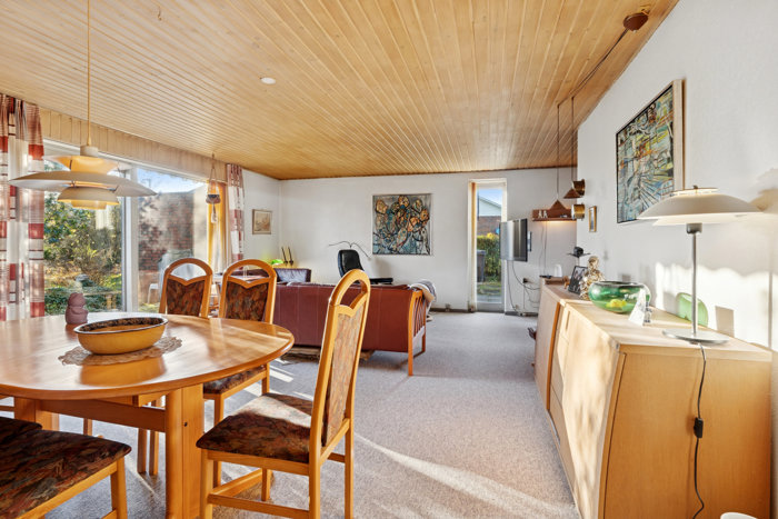 I forlængelse af køkkenet finder du en stor, lys stue med direkte udgang til haven – et skønt opholdsrum med mulighed for både afslapning og samvær.
