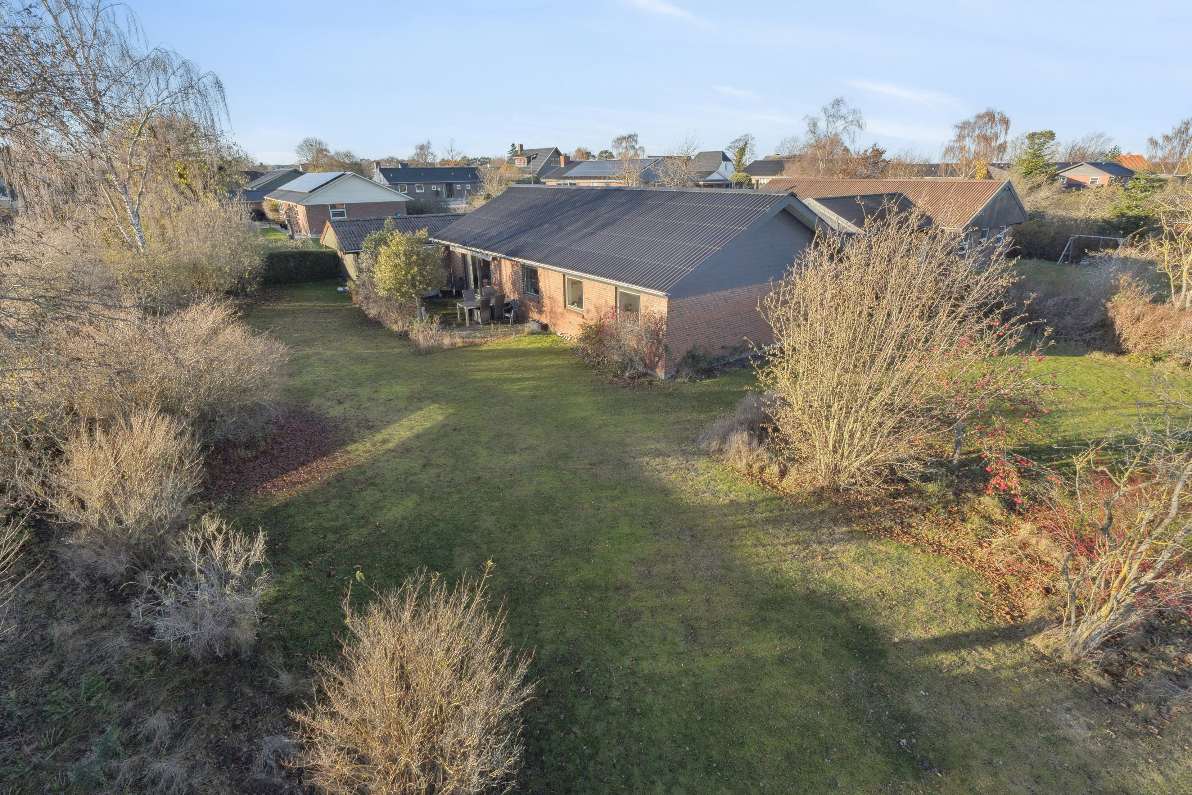 Udenfor venter en dejlig have, som kan indrettes efter behov – hvad enten man ønsker legeområde, køkkenhave eller hyggelige terrassemiljøer.