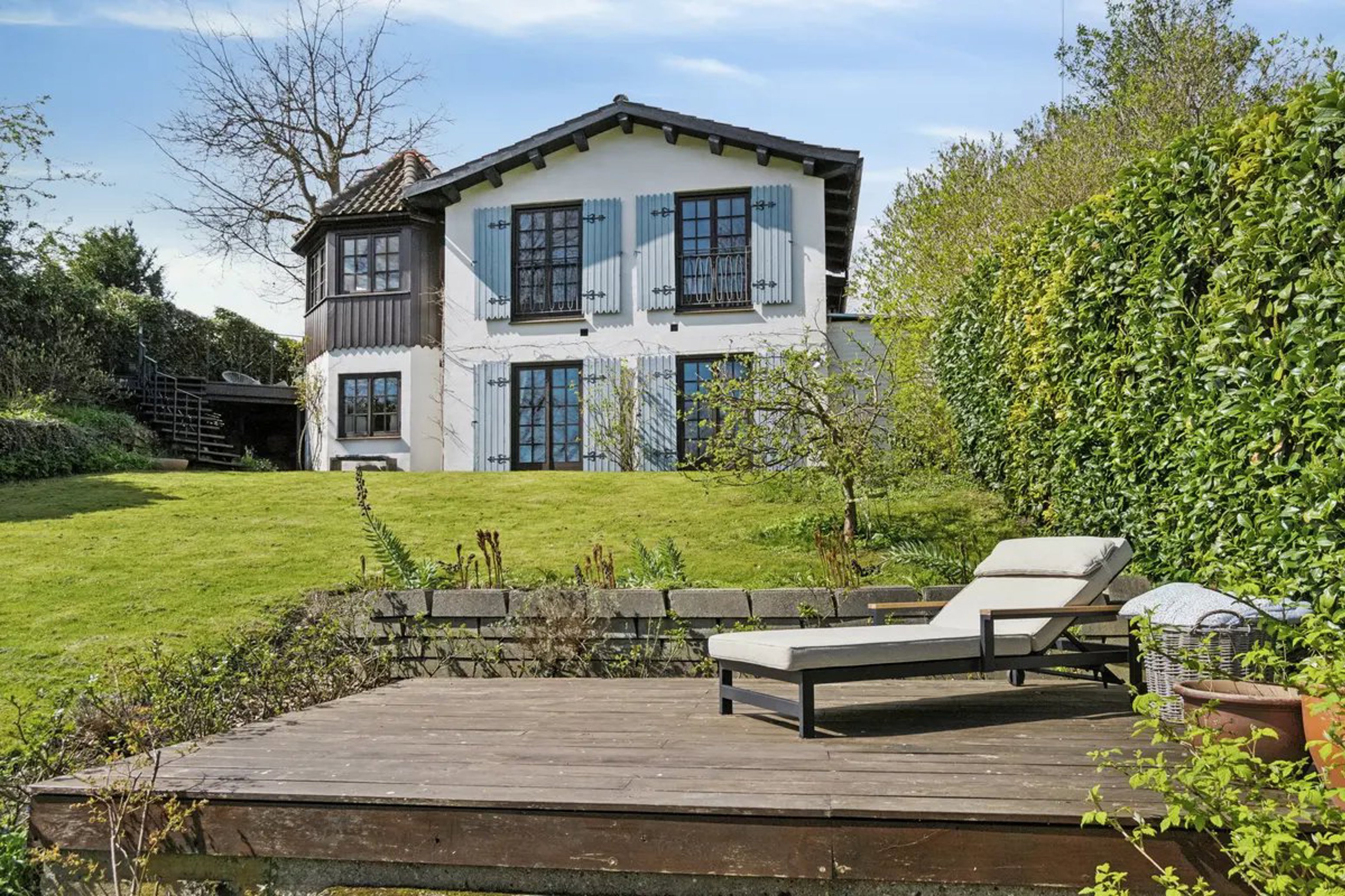 Villaen er opført i 1959 af en tømrermester med en udtalt forkærlighed for sydlandsk byggestil. Inspirationen mærkes stadig tydeligt – ikke som en kulisse, men som en gennemført atmosfære med fritlagte bjælker, romantiske tårnværelser, smukke lysindfald og fine detaljer som blå skodder og franske altaner, der tilsammen giver huset sin helt særlige karakter.