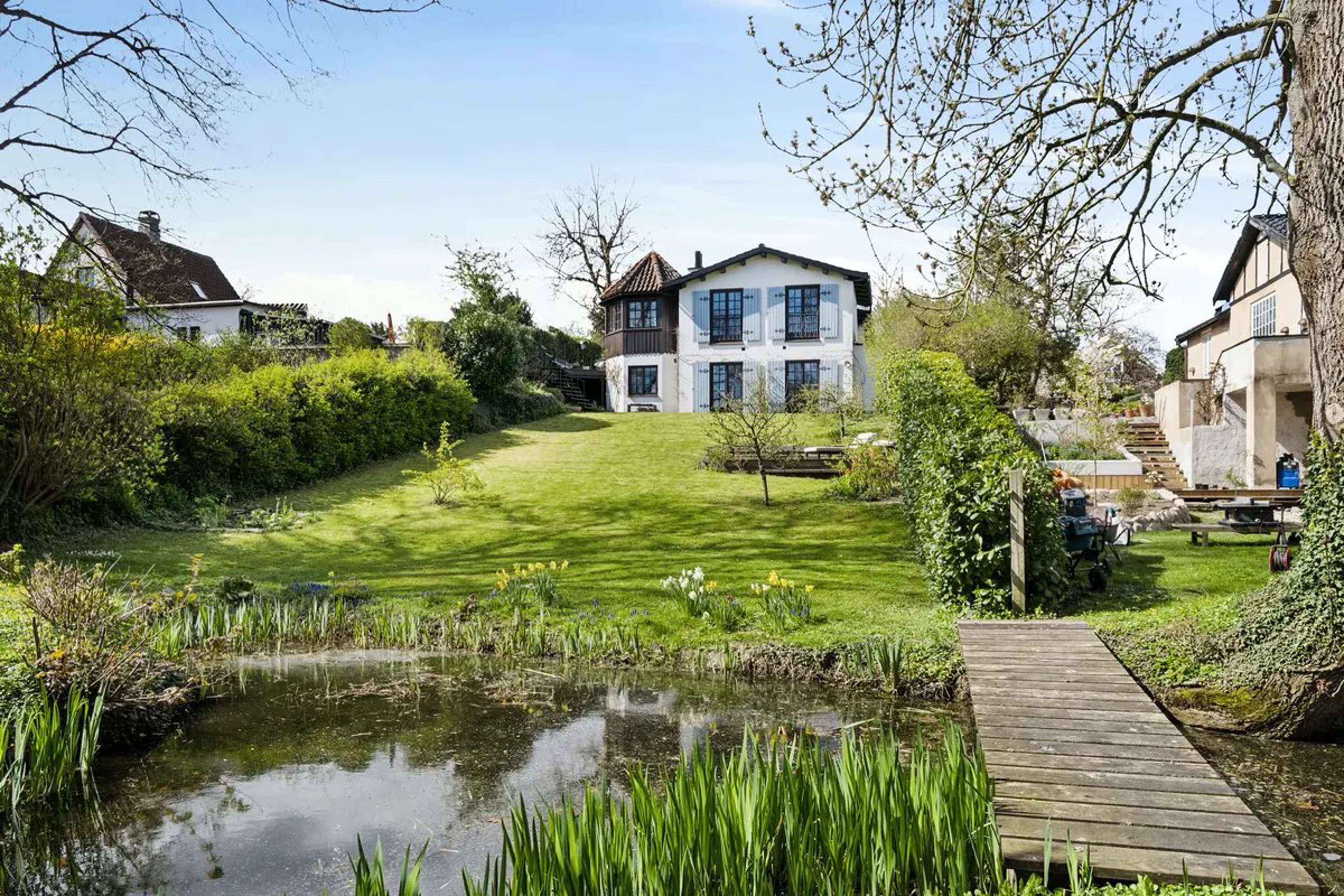 Fra den højt placerede villa skråner grunden blidt ned mod Gorkis Sø, hvor I har direkte adgang til egen søbred.