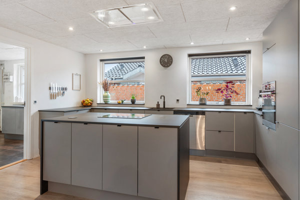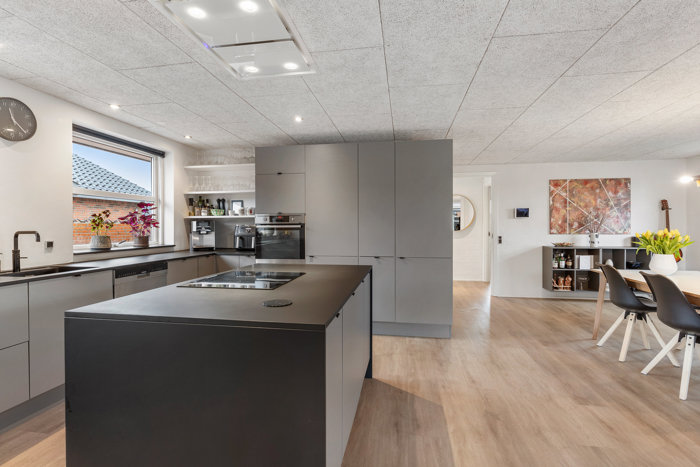 Køkkenet er opført i et stilrent og tidløst design fra HTH (2022) med køkkenø, gode arbejdsflader og god opbevaringsplads. Her er der tænkt i både funktionalitet og æstetik, og køkkenet ligger naturligt i åben forbindelse med spisepladsen.