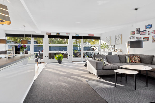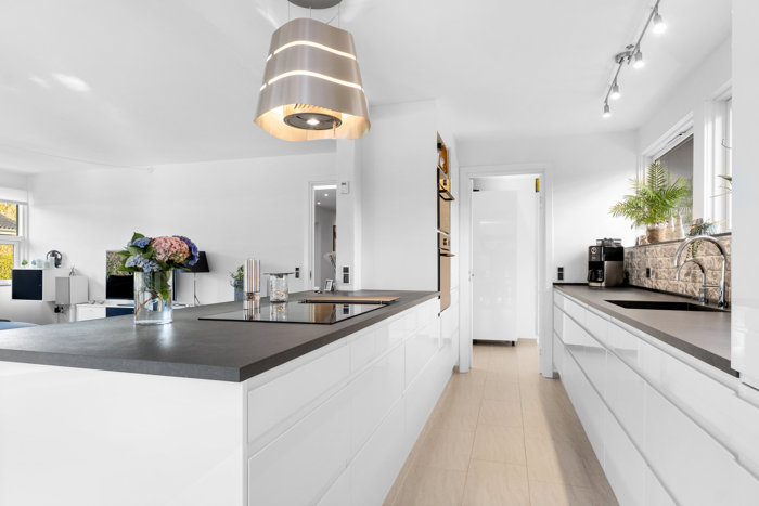 Indenfor mødes du af en lys og imødekommende atmosfære. Den nænsomme renovering mærkes straks: gulvvarme i alle rum giver en behagelig, jævn varme, og de lyse materialer lader dagslyset danse gennem huset fra morgen til aften. Samtidig er der installeret solcelleanlæg, som bidrager til at sænke udgiften til el og giver en mere bæredygtig hverdag. Entréen leder dig naturligt ind til hjemmets hjerte – det store alrum med køkken og stue i åben forbindelse. Her strømmer lyset ind fra flere sider, og de brede terrassedøre trækker haven helt ind i rummet. Forestil dig morgenkaffen ved køkkenøen, mens du ser solen stå op over terrassen, eller lange middage med venner, hvor samtalerne flyder frit mellem køkken og stue.
