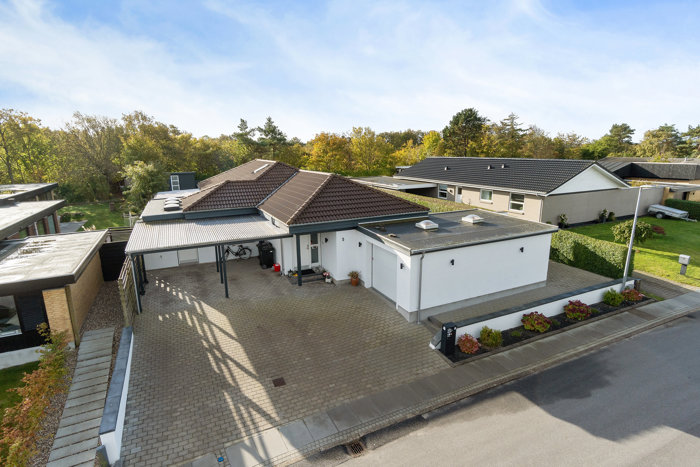 Hele huset er skabt til at rumme både familieliv og rolige stunder. Fra den overdækkede terrasse, der forlænger udesæsonen, til de lyse, luftige opholdsrum, hvor man automatisk sænker skuldrene. Her får du en bolig, hvor hver eneste detalje er tænkt igennem, og hvor varme og kvalitet kan mærkes i både materialer og atmosfære – et sted, der føles som hjem fra det øjeblik, du træder indenfor.
