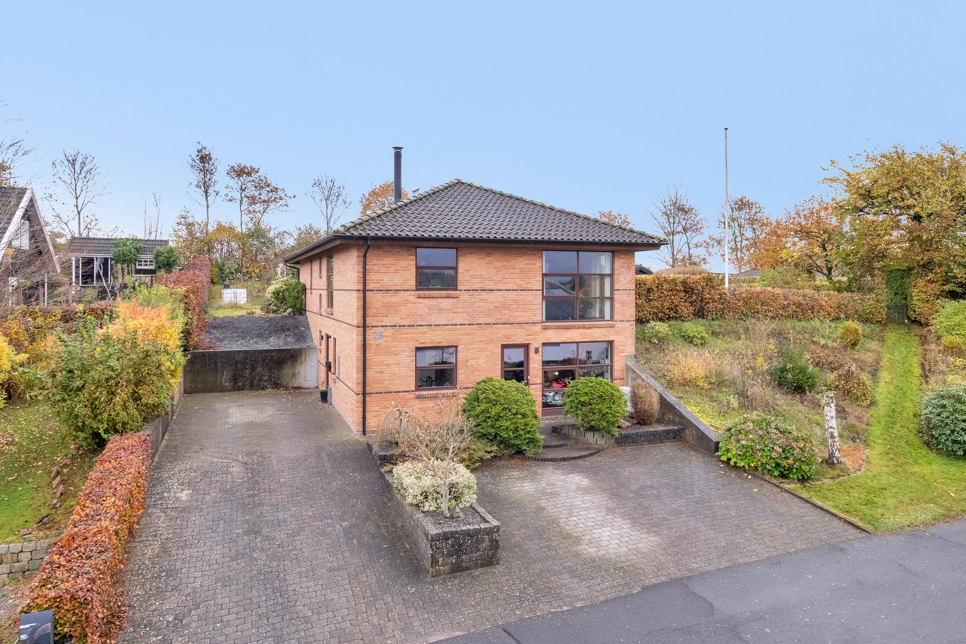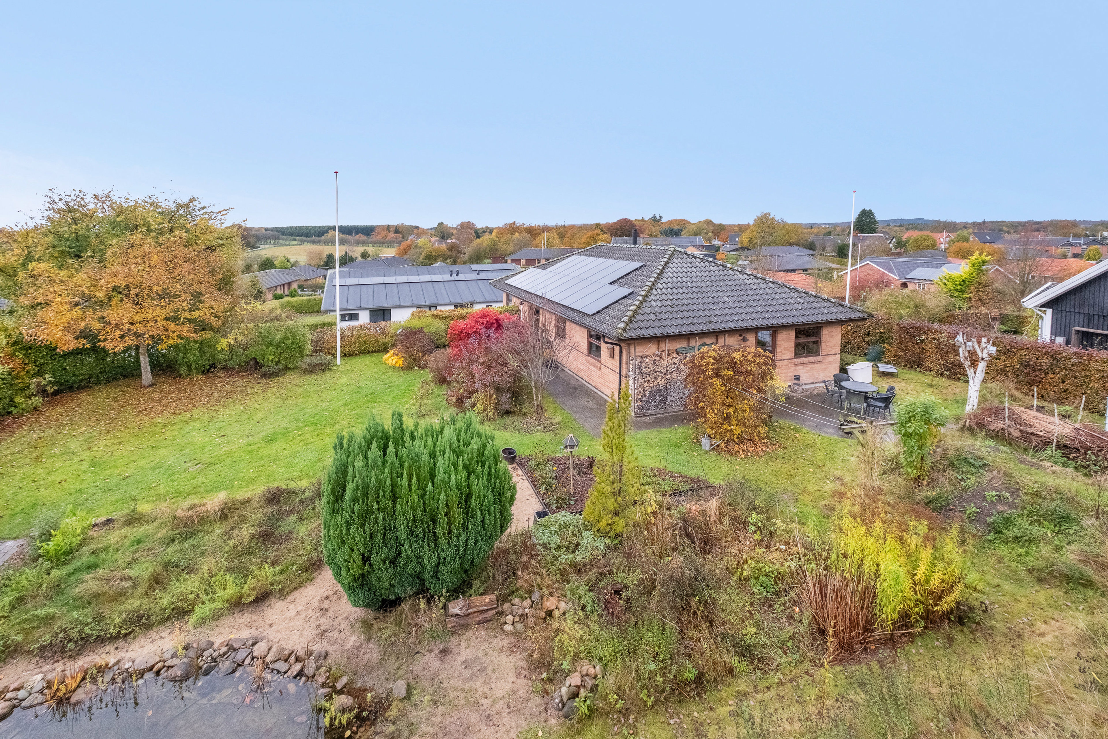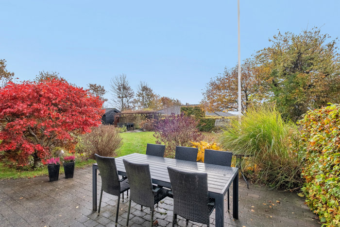 Haven er en sand oase, hvor I kan nyde naturen og privatlivet på den store, hævede grund på hele 1.399 m². Her er der rig mulighed for at skabe jeres egen grønne drøm – med frugttræer, havedam, solrige terrasser eller små hyggekroge. Kun fantasien sætter grænser.