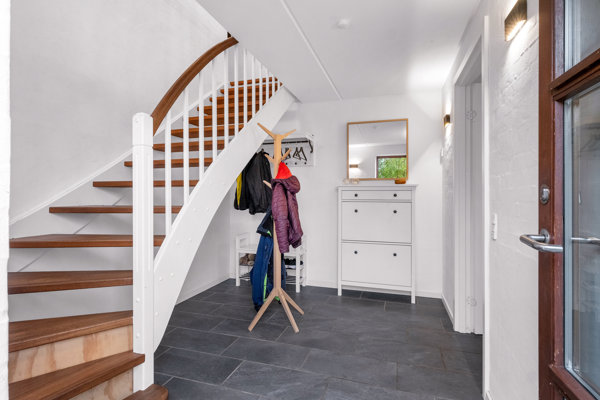 Når I træder ind i boligen, bliver I budt velkommen i en indbydende entré med den helt rette størrelse – perfekt til både hverdagens travlhed og når gæsterne skal bydes indenfor. Lige ved siden af finder I et praktisk bryggers, som er diskret placeret, så vasketøjet kan holdes ude af syne, når der kommer besøg.