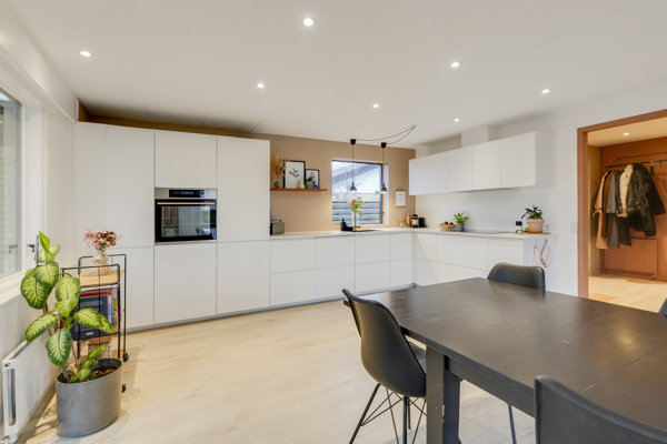 Vådrummene tæller et pænt badeværelse og et gæstetoilet, mens bryggerset lever op til sine praktiske opgaver med god plads til vaskefaciliteter og opbevaring. Den oprindelige planløsning er også opgraderet, så I får et åbent opholdsområde, hvor køkken-alrummet og stuen arbejder sammen. Der er installeret varmepumpe i hjørnet, og derudover fremstår køkkenet som boligens måske mest indbydende rum med hvide, grebsfri elementer og indbyggede spots.