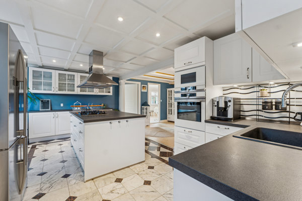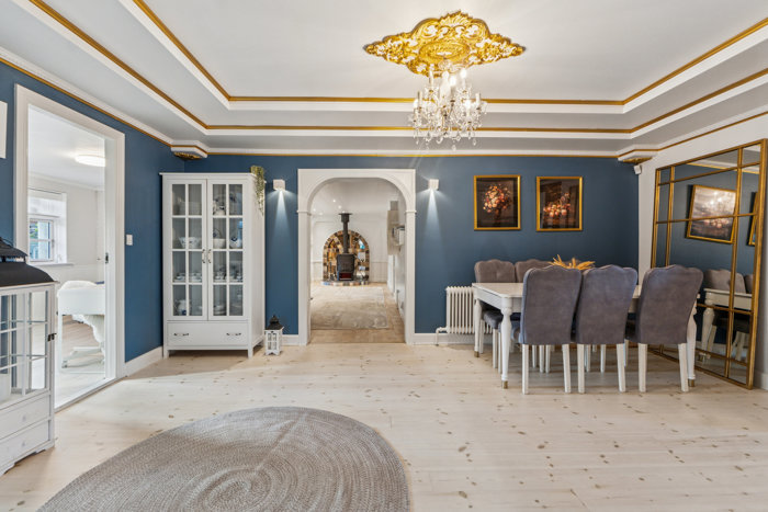 Indenfor er boligen indrettet lige til familielivet. Der er både en entré til gæster og et bryggers til hverdagens hurtige indgange – smart placeret med direkte adgang fra carporten, så I kan komme tørskoede ind med børn, tasker og indkøb. Køkkenet har masser af arbejdsplads, og den åbne forbindelse til stuerne giver en naturlig samlingsplads, hvor middagsmad, lektier og leg kan foregå side om side. De fine detaljer som stuk og søjler giver boligen personlighed, og udestuen forlænger opholdsmiljøet med endnu et lyst rum til hygge.