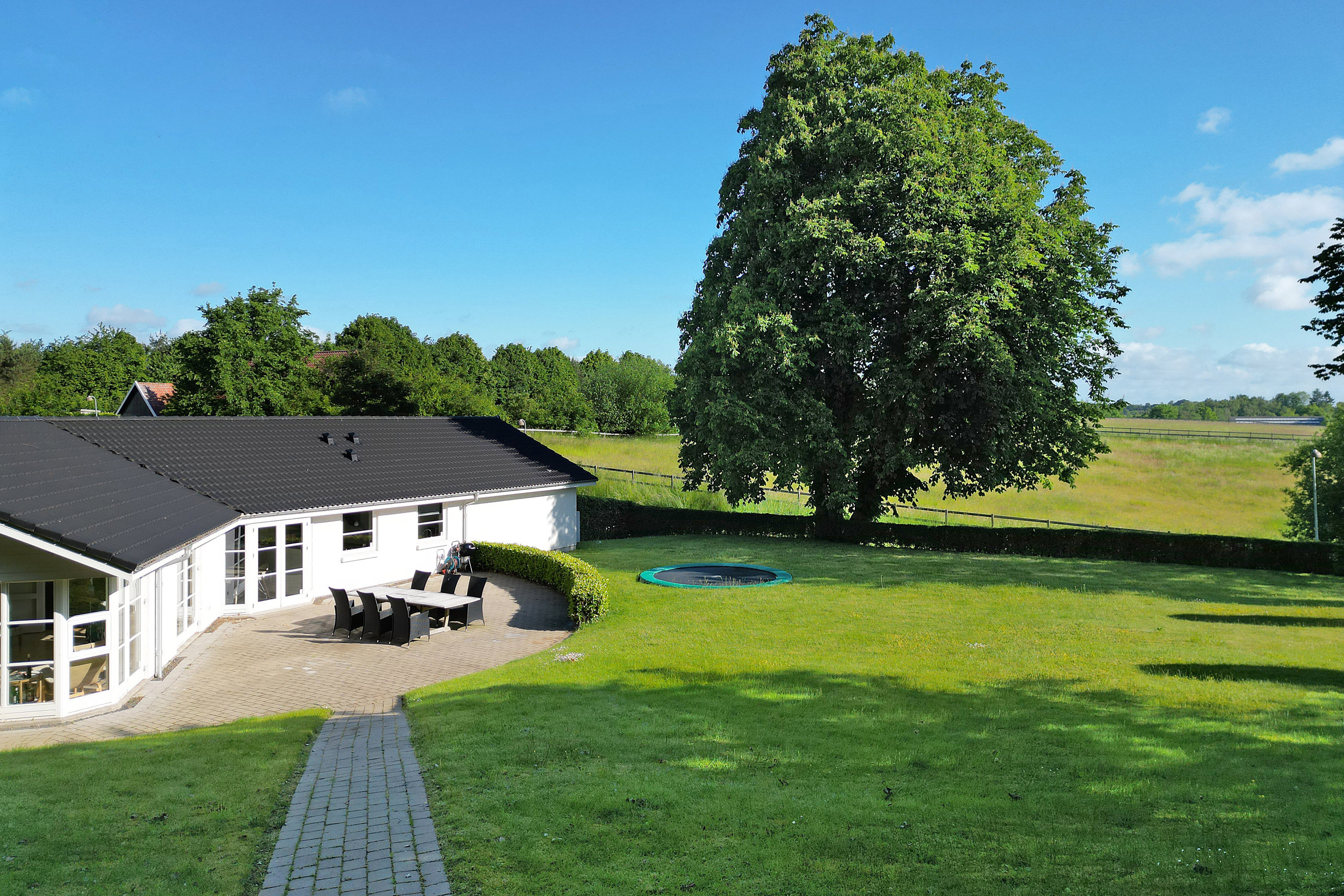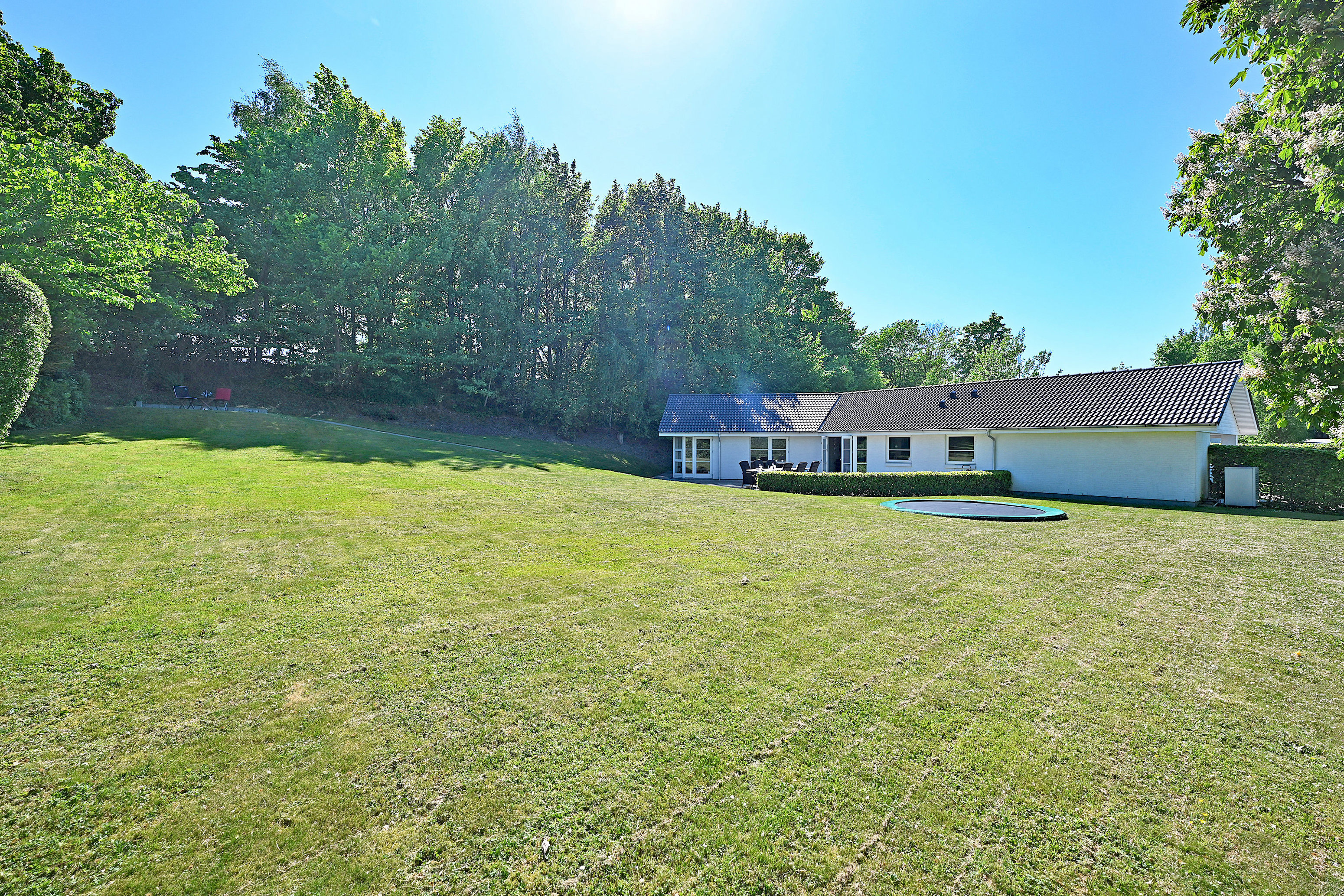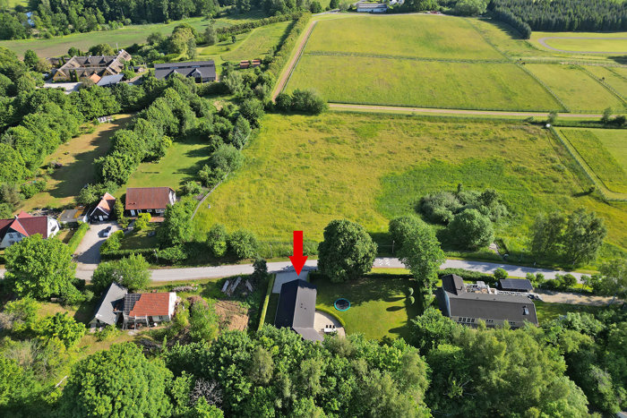 Ejendommen er beliggende på en mere end 1.500 m2 stor grund med fri udsigt til marker og hestefolde samt med skoven i baghaven. Bedre fås det ikke!