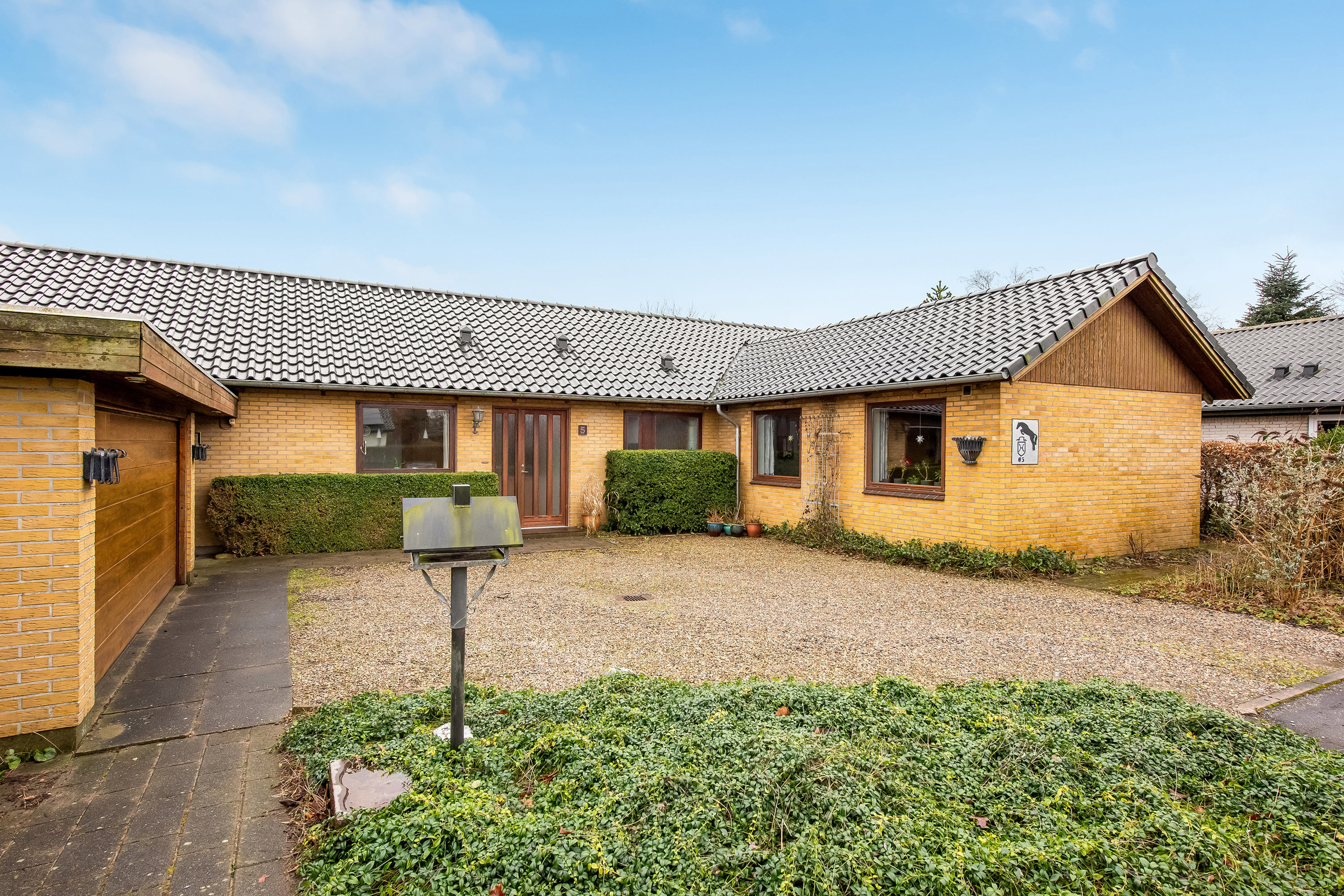 På Grønningen 5 i Rødekro træder du ind i en indbydende arkitekttegnet villa med klassisk profil, hvor de gule sten, de store vinduespartier og den velafgrænsede forhave giver et rart førstehåndsindtryk. Den rummelige gårdsplads og den integrerede garage skaber en behagelig ankomst og gode rammer om hverdagens praktiske gøremål. Huset opleves som et solidt og velfungerende hjem med plads til både ro og fællesskab.