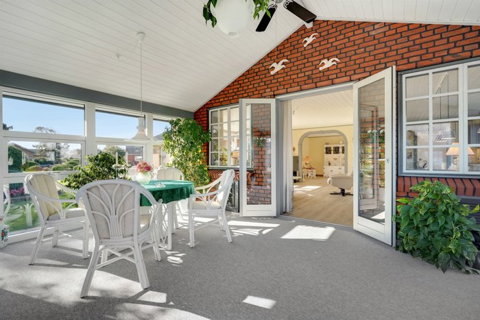 Et af boligens højdepunkter er den lyse udestue med loft til kip og store vinduespartier, som inviterer naturen helt ind i hjemmet. En udestue der kan nydes hele året.