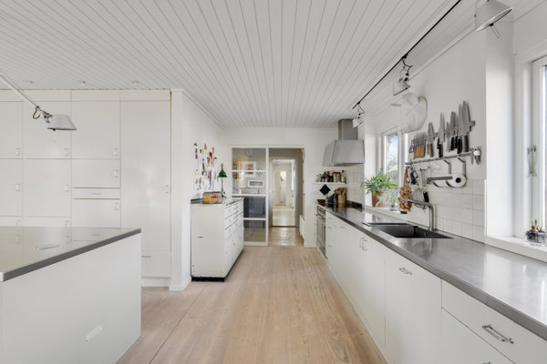 Alligevel er køkken-alrummet muligvis villaens skønneste samlingspunkt. Tre dobbeltdøre skaber en sublim forbindelse til haven, og selvom køkkenet efterhånden har et par årtier bag sig, er det lyst og velfungerende. Selve elementerne er i god stand, så I kan få en hurtig køkkenopgradering ved at udskifte eksempelvis låger. Udformningen med køkkenø med siddepladser vil I nok holde fast i. Slutteligt byder boligen på et praktisk bryggers og en elegant, lys entré.