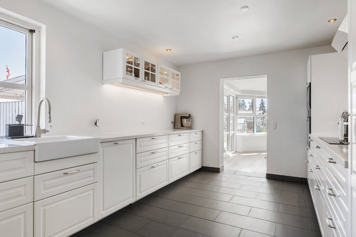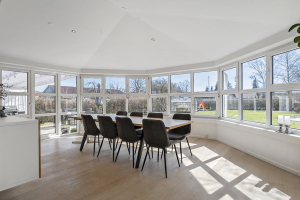 Fra det lyse køkken, som har god bord- og skabsplads, træder du direkte ind i den store spisestue. Her får du et fantastisk lysindfald fra de store vinduespartier samt udgang til en overdækket terrasse. Rummet føles næsten som et orangeri og indbyder til grønne planter og hyggelige stunder året rundt. Spisestuen ligger i åben forbindelse med opholdsstuen, hvilket skaber et naturligt flow og masser af lys i hele opholdsområdet. Fra stuen er der desuden adgang til et soveværelse. Perfekt hvis du ønsker at bo i ét plan.