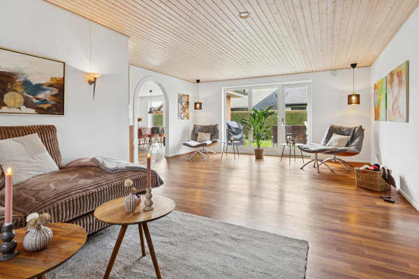 Boligen centrerer sig omkring to store opholdsrum, nemlig stuen og køkken-alrummet. I sidstnævnte tiltrækker det elegante køkken med hvide fronter sig en del opmærksomhed, og i den tilstødende stue er det især de mange indretningsmuligheder, I vil bide mærke i.