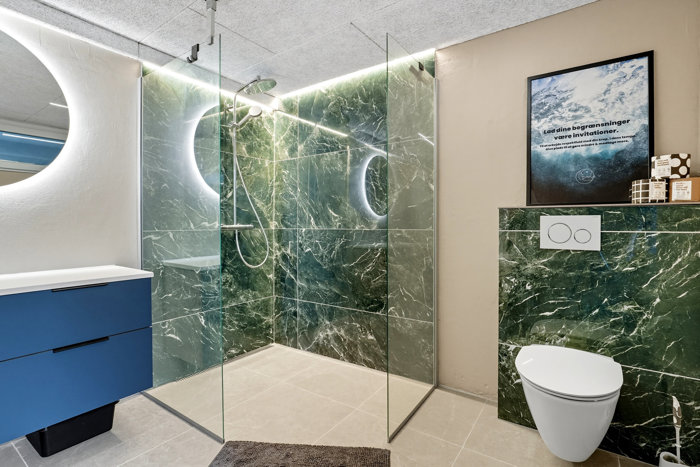 Planløsningen rummer desuden en entré med god opbevaringsplads, fordelingsgang, to værelser samt soveværelse. Badeværelserne fremstår med flotte, markante materialer og en stilren indretning, der passer fint til resten af boligens moderne linje. Det giver en god sammenhæng i hjemmet og understøtter oplevelsen af en bolig, hvor æstetik og funktion går hånd i hånd.