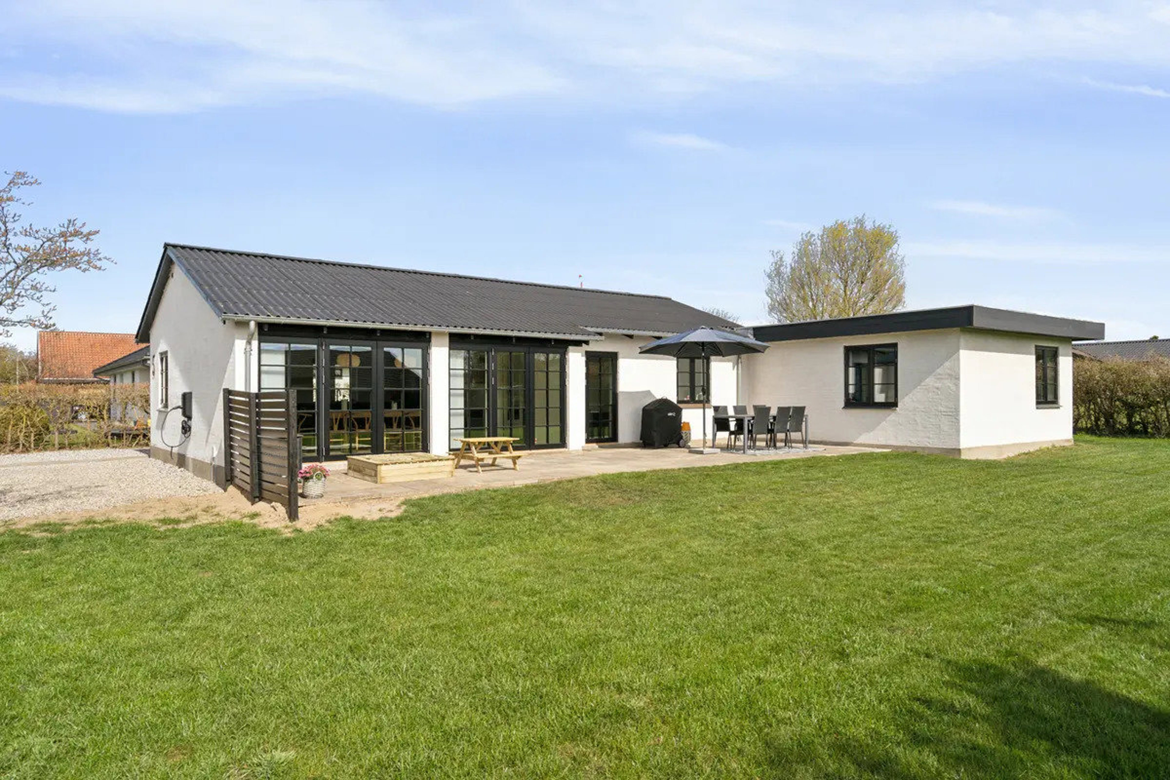 Boligen er placeret på en stor og velholdt grund med plads til både leg og afslapning. Haven vender perfekt for solen, og den sydvendte terrasse bliver hurtigt samlingspunktet, når vejret tillader det. Her kan du nyde morgenkaffen i fredelige omgivelser eller invitere til lange sommeraftener med venner og familie.