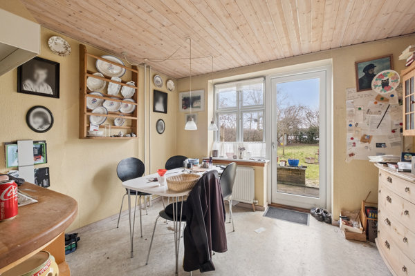 Man ankommer via entréen i stueplan, hvor trappen forbinder husets tre etager. Herfra åbner boligen sig mod køkkenet, som ligger i naturlig forbindelse med alrummet. Det er let at forestille sig, hvordan rummet kan blive husets samlingspunkt igen – et sted hvor morgenlyset falder ind over spisebordet, og hvor døren til terrassen kan stå åben på lune dage. Terrassen ligger lige udenfor og giver en fin overgang mellem inde og ude.