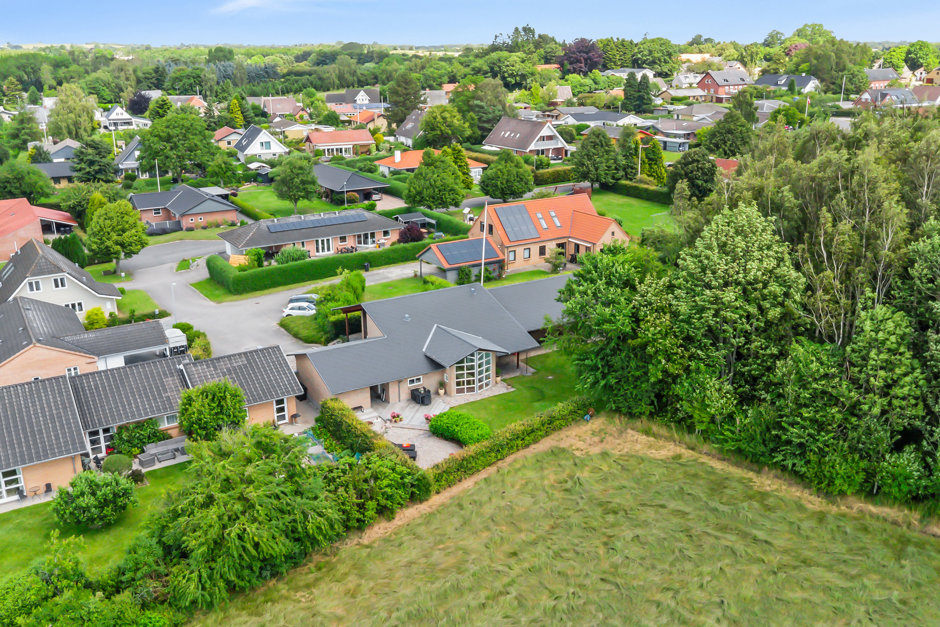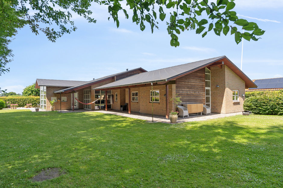 Villaen er arkitekttegnet og opført i en markant stil med synlige bærende bjælker, masser af skæve vinkler, ekstra loftshøjde samt store vinduespartier, der sikrer et fantastisk lysindfald og udsigt til naturen fra allerførste parket. Samtidig har der været fokus rummelighed og funktionalitet, der giver de helt optimale rammer for både den store familie – eller dem, der blot ønsker mere plads samt privatliv.