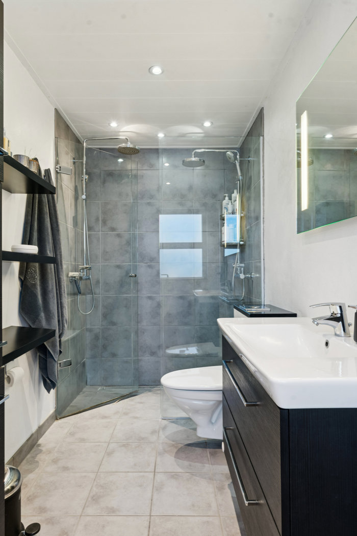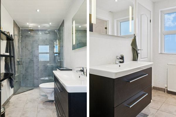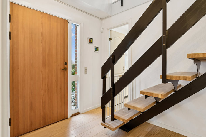 På overetagen bliver du mødt af en lys og rummelig stue med loft til kip og ovenlysvinduer, der tilfører masser af naturligt lys. Herfra har du direkte adgang til en svalegang med en skøn udsigt over området. Førstesalen byder desuden på yderligere tre værelser og endnu et badeværelse – perfekt til børneværelser, kontor eller gæster.