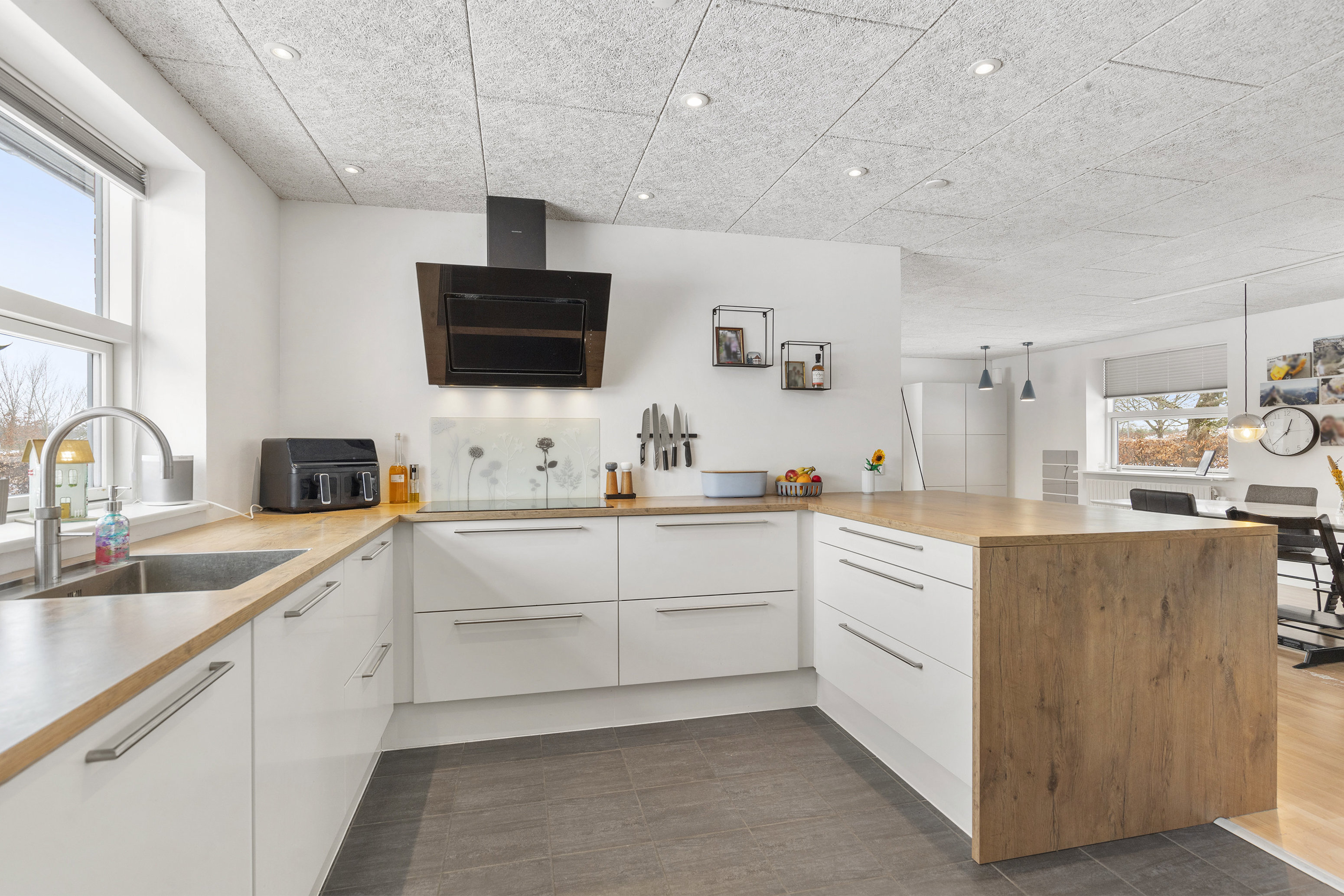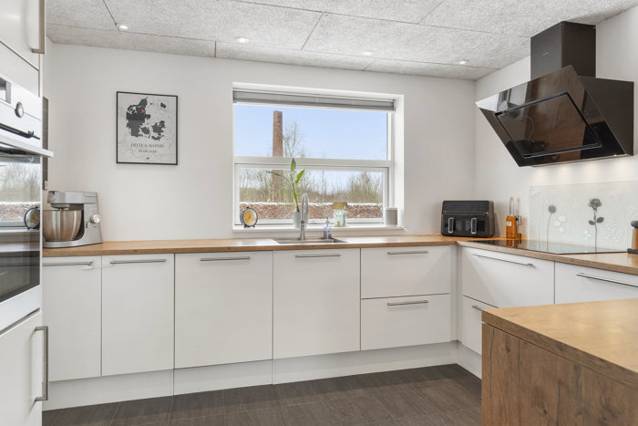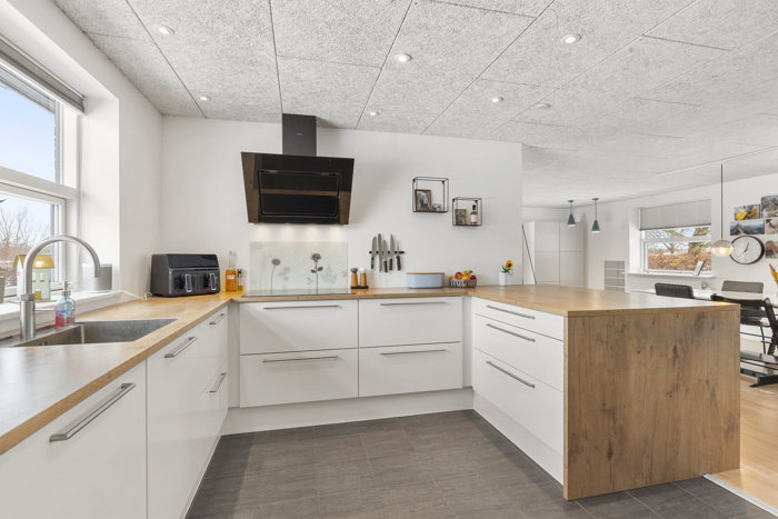 Boligens naturlige samlingspunkt er den store opholdsafdeling, hvor køkken, alrum og vinkelstue ligger i åben forbindelse. Rumforløbet giver en skøn sammenhæng og masser af plads til både hverdag og gæster. Vinduerne i stueplan fra 2015 sikrer et dejligt lysindfald, og Troldtekt-lofter fra 2017 bidrager flere steder med både god akustik og et moderne udtryk. Køkkenet er et stilrent Designa-køkken fra 2017 med god arbejdsplads, praktisk halvø og fin opbevaringsplads – et oplagt sted at samles omkring madlavningen.
