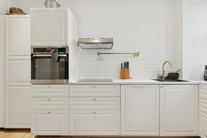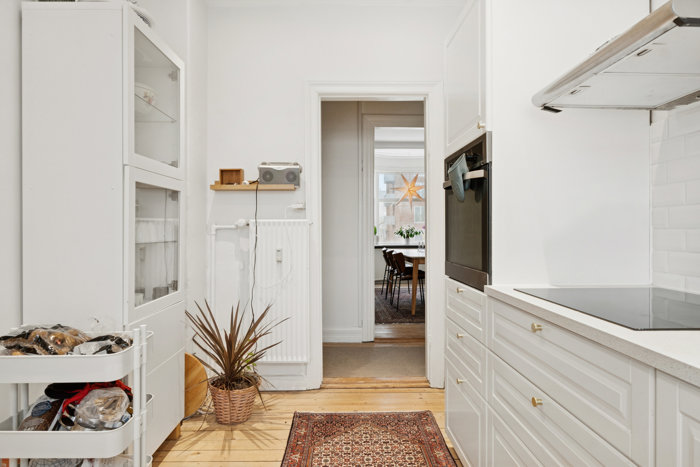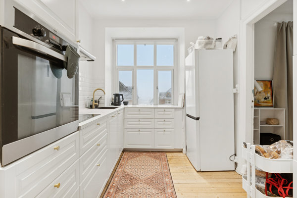 På førstesalen finder du endnu en selvstændig bolig med nyere køkken og nyt badeværelse. Et godt soveværelse samt to store stuer en suite giver en herskabelig fornemmelse og masser af plads. Ønsker man flere værelser, kan planløsningen nemt tilpasses, så den ene stue opdeles til et ekstra værelse – præcis som på etagen nedenunder.