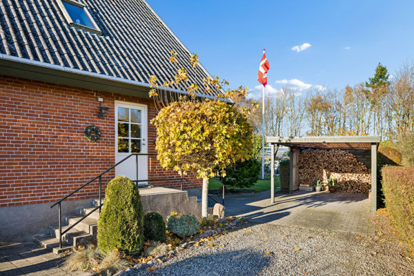 Fra stuen er der udgang til en stor sydøstvendt altan, delvist overdækket af taget. Her kan I opholde jer ude i mange af døgnets timer og følge dagens gang, mens udsigten over markerne folder sig ud.