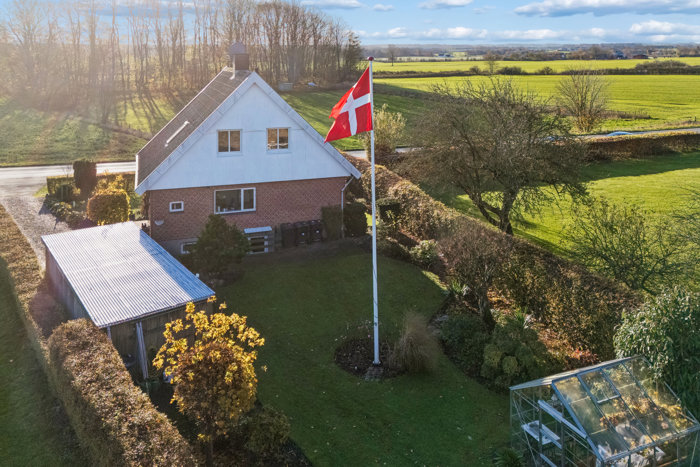 Udenfor møder I en skøn have med græs, bede og enkelte træer, der skaber grønne, afslappede rammer omkring huset. Terrasser langs huset giver mulighed for at følge solen og indrette flere uderum, hvor udsigten mod markerne igen understreger følelsen af plads, lys og luft.