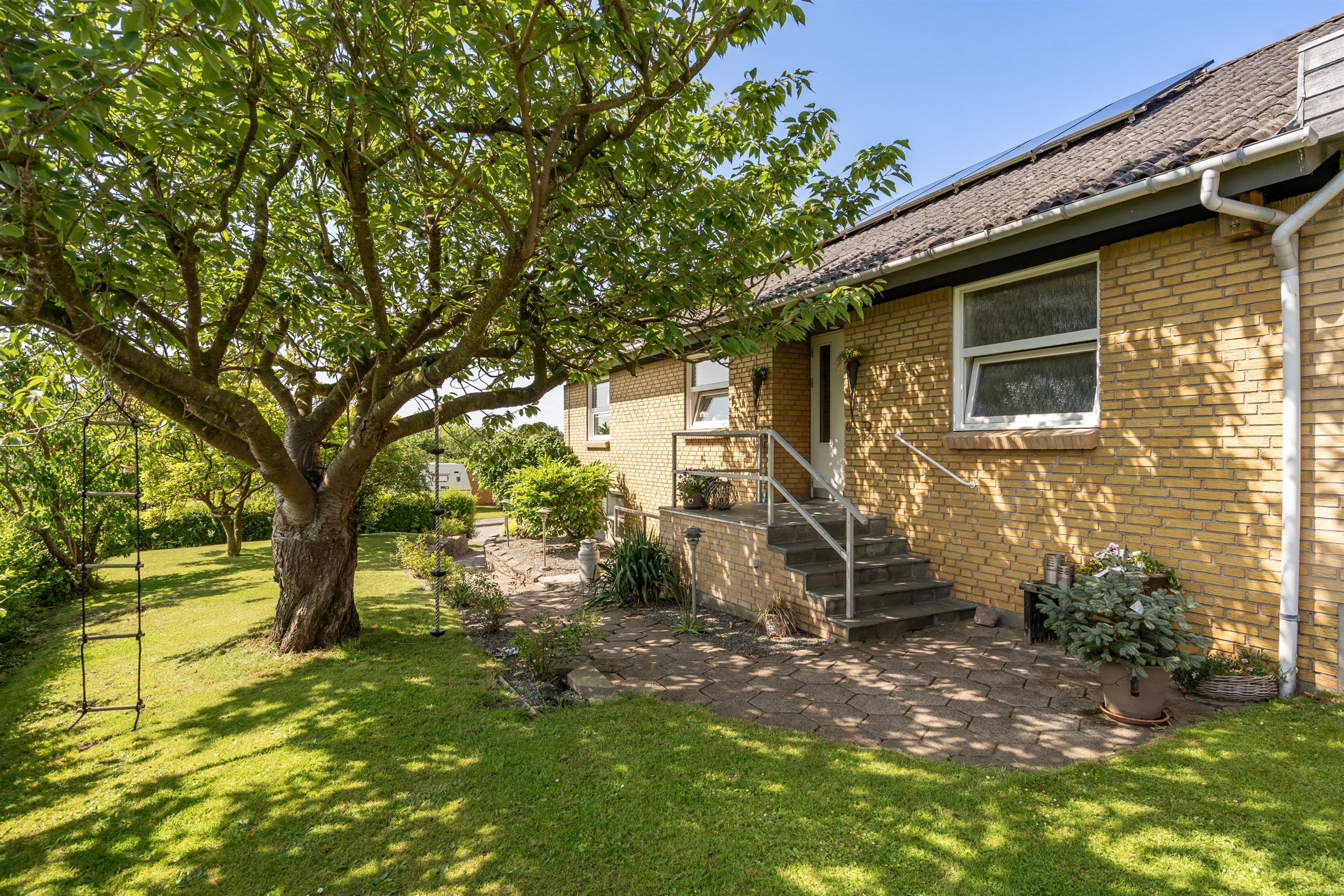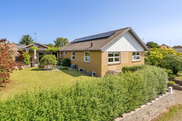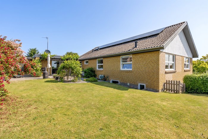 Haven er nem at holde og byder på et grønt græsareal, farverige blomsterbede, buske og ikke mindst en skøn terrasse, der vender perfekt mod syd og vest – ideel til solrige eftermiddage og lange sommeraftener.
