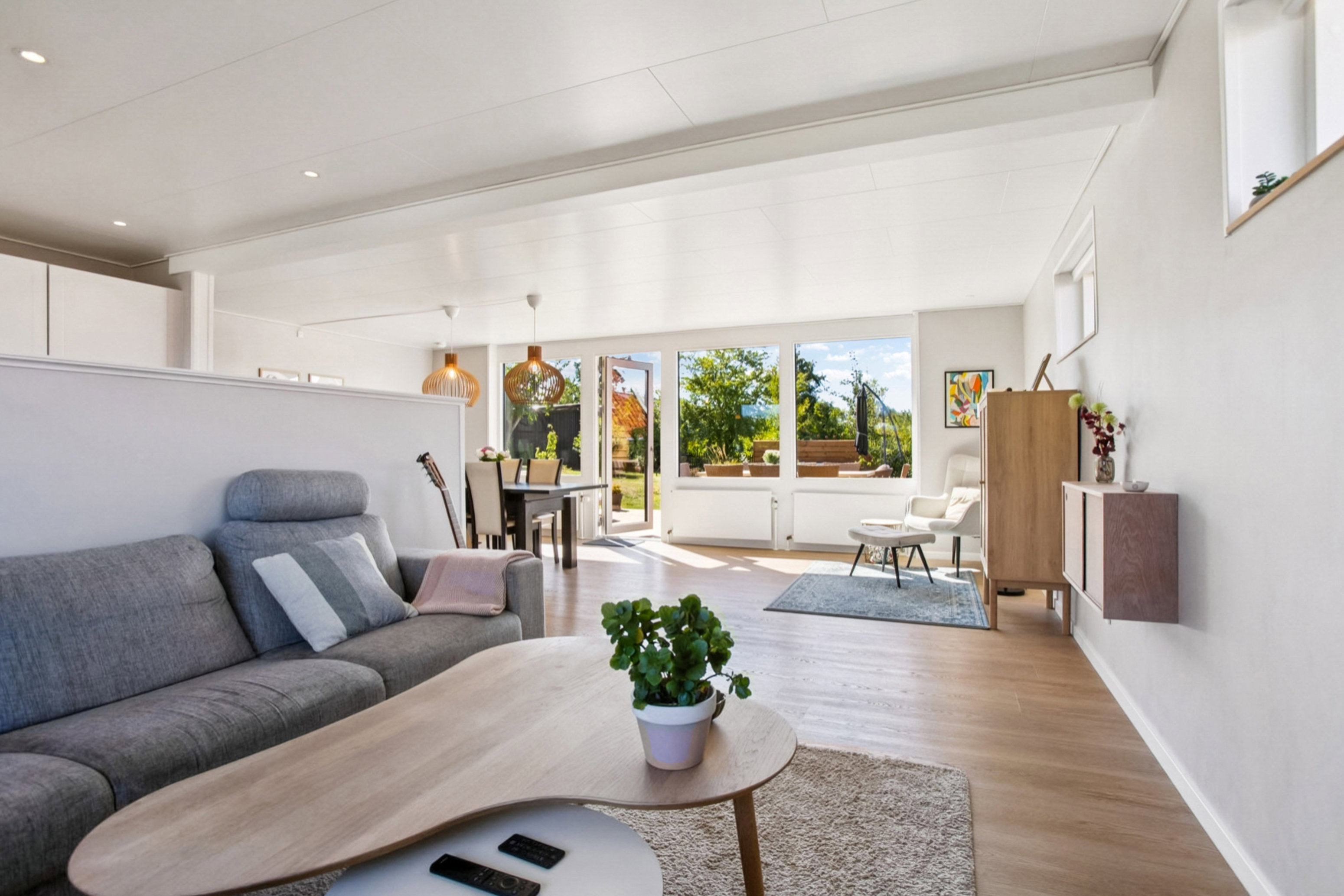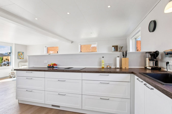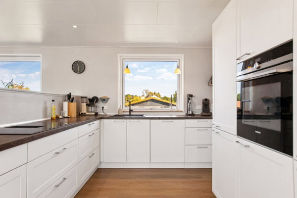 Boligens naturlige samlingspunkt er det åbne og moderne køkken-alrum, der er i åben forbindelse med stuen. Her strømmer lyset ind gennem de store vinduespartier, og rummet åbner sig elegant ud mod den sydvendte terrasse og den ugenerede have. Haven byder på flere hyggelige terrassemiljøer og gode solforhold – perfekt til både afslapning og leg.