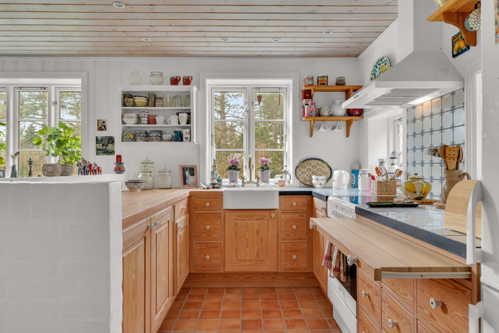 Allerede udefra står udtrykket klart med facader i mørkeblå nordsvensk gran, vinduer og døre i sibirisk lærk og et rødt tegltag med charmerende kviste. Til bilen er der plads til parkering foran huset, og ved siden af følger udhusene med – både et indbygget på 6 m² og et matchende udhus på 12 m² fra 2009. Det betyder, at praktikken altid er på plads.