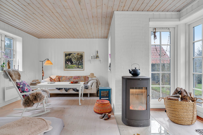 Inden døre fortsætter den samme sikre linje, hvor lofter og en lys, rolig og ærlig stemning byder velkommen. Spanske gulvklinker med indlagt gulvvarme møder lyse plankegulve, og alt sammen holdes sammen af de gedigne detaljer: snedkerkøkken fra Dansk Køkkenhåndværk med porcelænsvask og Toni-armatur, sicilianske vægfliser og et badeværelse, der er helt sit eget med mexicansk håndvask i den massive træbordplade. Som modspil til det fine står en Morsø-brændeovn i stuen og spreder rustik varme, og når vejret er til det, slår I bare den dobbelte terrassedør op til det fri. Oppe på første sal træder opholdsstuen i karakter med loft til kip og udgang til altanen, hvor den grønne udsigt er allerbedst. Ved siden af ligger der et hyggeligt soveværelse med stort indbygget skab fra "Invita" – enkelt, velfungerende, uden støj.