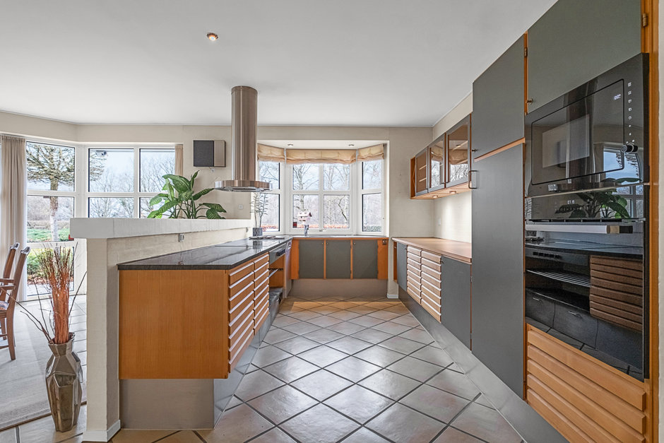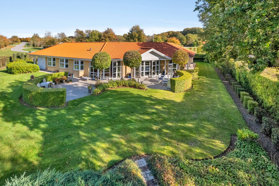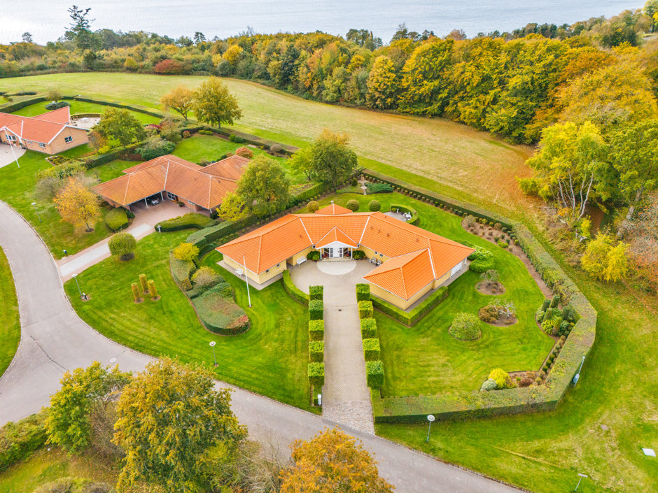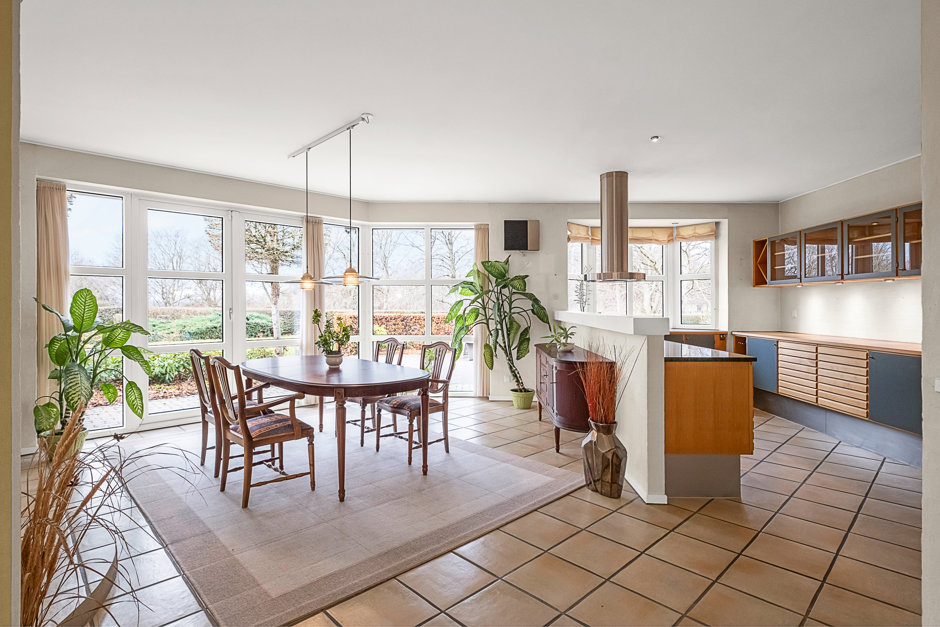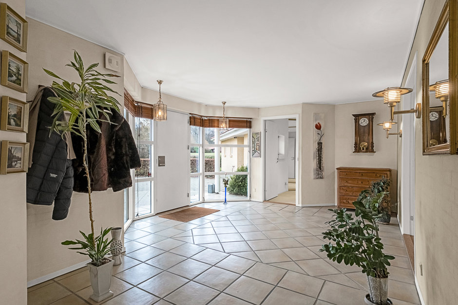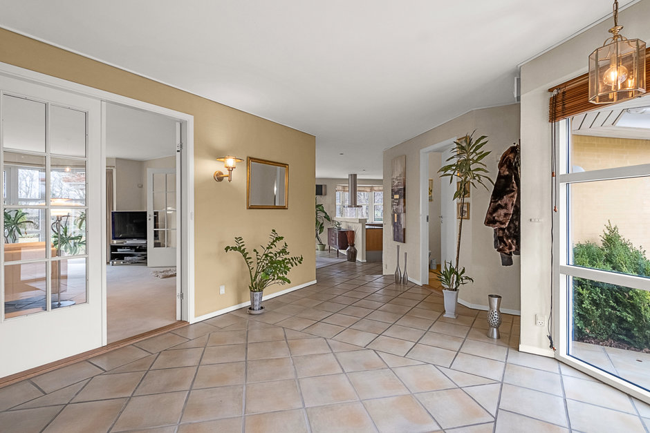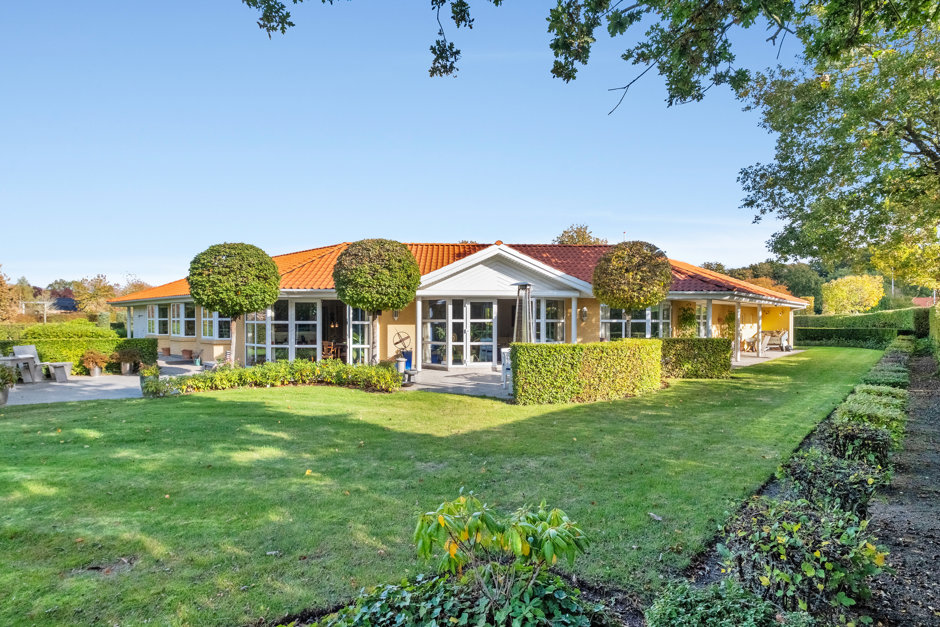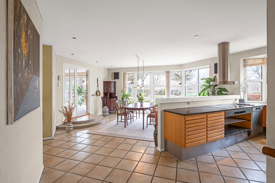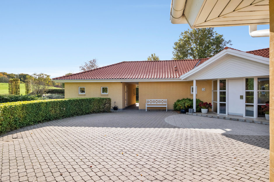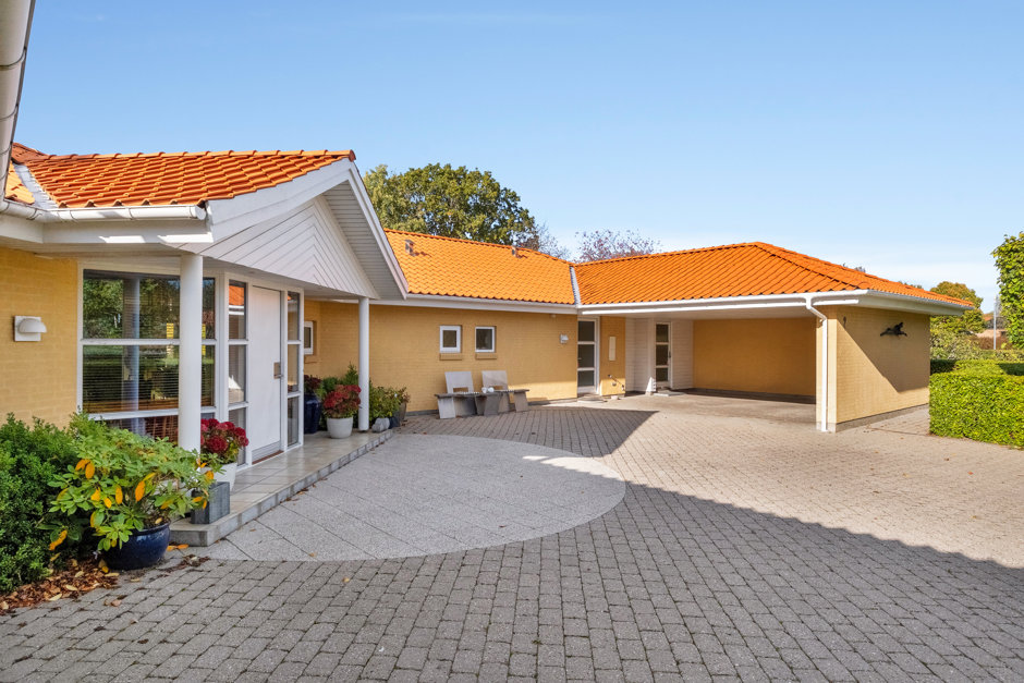 Villaen præsenterer sig med elegant arkitektur, rødt tegltag og harmoniske facader, hvor store vinduespartier forbinder inde og ude. Planløsningen er gennemtænkt med gode afdelinger, så der er plads til både samvær og privatliv. Man ankommer via en præsentabel entré til et rummeligt køkkenalrum, der fungerer som hjemmets samlingspunkt med fine kig til haven.