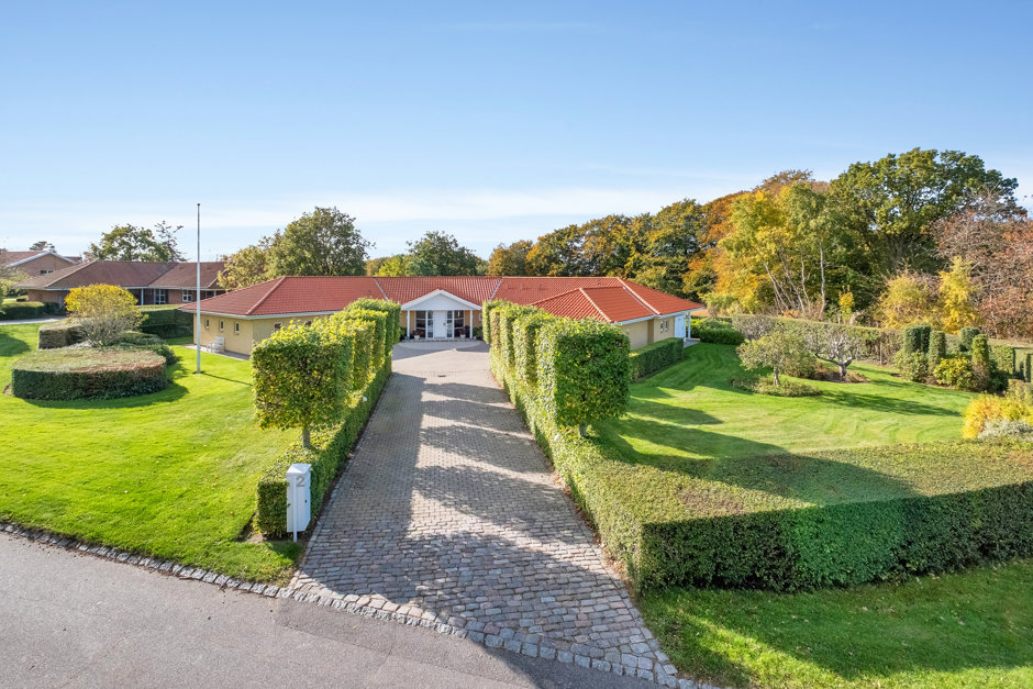 Grunden er smukt anlagt med grønne plæner, klippede hække, solrige opholdsrum og velvalgt beplantning, som indrammer ejendommen. Kombinationen af eksklusiv beliggenhed, gennemført arkitektur og funktionelle kvadratmeter giver en helstøbt helhed, der sjældent udbydes i Højvangen.