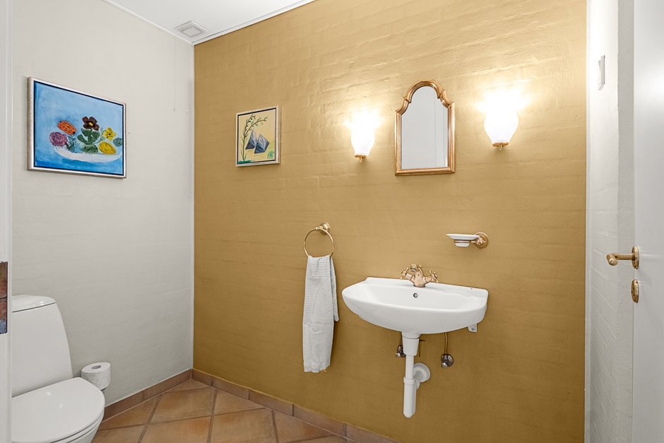 Indretningen rummer tre værelser, hvoraf det ene har walk-in-closet og eget badeværelse. Derudover er der endnu et badeværelse, gæstetoilet, praktisk bryggers samt to disponible rum.