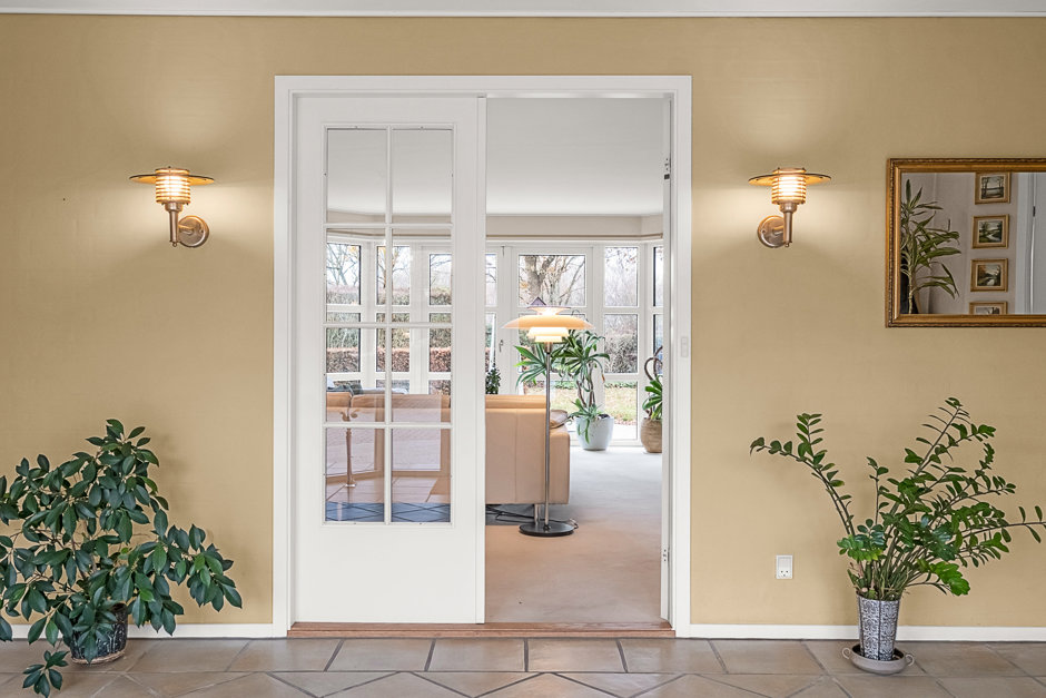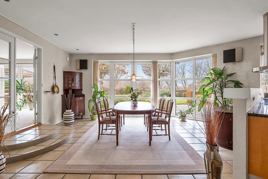 Fra alrummet er der adgang til to stuer i forlængelse af hinanden, som skaber en flydende forbindelse gennem huset. Flere dobbeltdøre åbner mod terrasserne, så sommerdagene kan leves i tæt kontakt med uderummet.