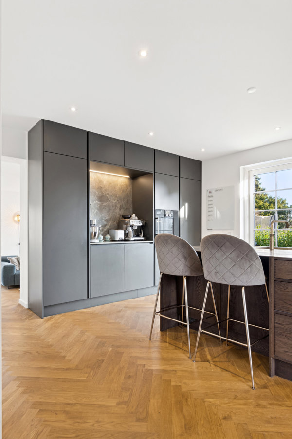 familie drømmer om. Én ting er sikkert…du får et hjem udover det sædvanlige, idet nuværende ejer har istandsat, tilbygget og ombygget huset således det fremstår helt klar til indflytning og uden nogen vedligeholdelse de næste mange mange år! Istandsættelsen er lavet i en utroligt høj kvalitet og hjerte og byder blandt andet på et snedkerkøkken, snedkerskabe, nyt massivt sildebensparket gulv, gulvvarme I hele huset, nye vinduer, ny facade, ny tagterrasse og meget mere!
